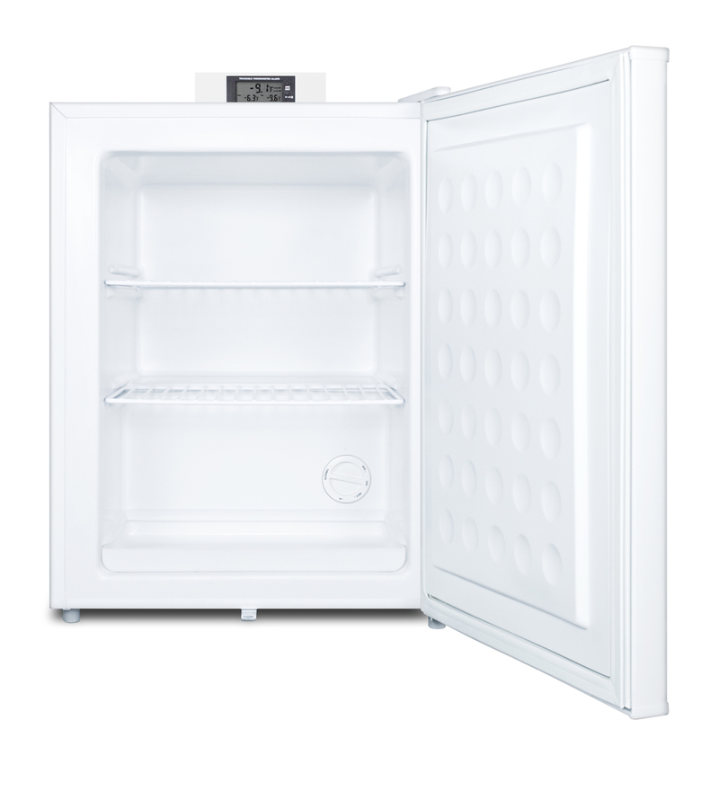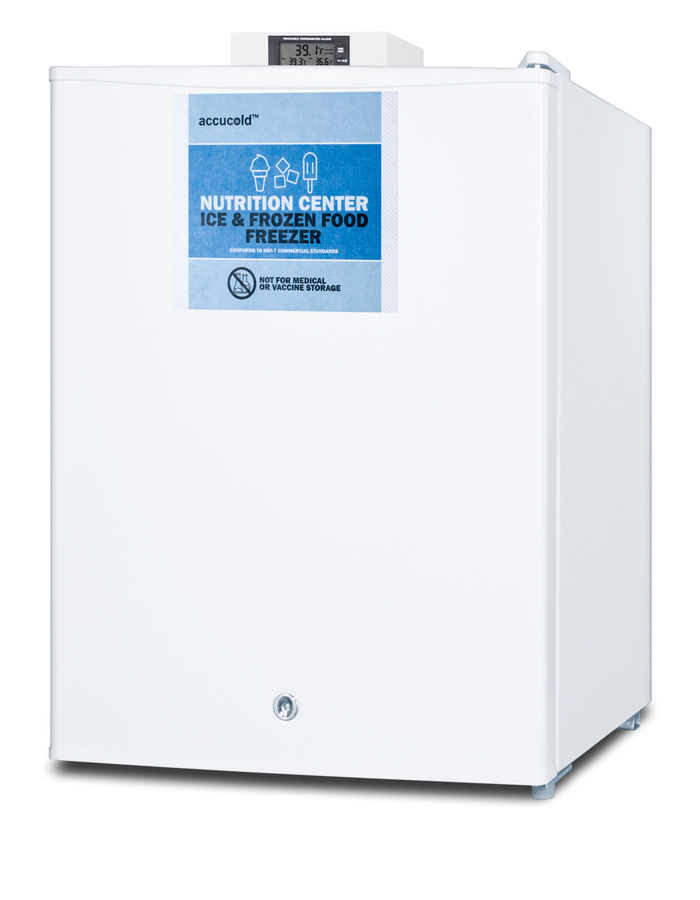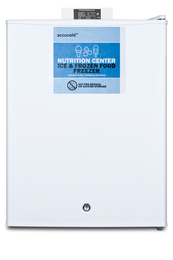 Accucold's Nutrition Center Series features commercially approved refrigerators and freezers specifically designed for the storage of sealed food and beverages in a variety of facilities, including break rooms, waiting areas, nurses' stations, and more. The FS317NZ is a compact all-freezer sized for countertop use. It is ETL-S listed to NSF-7 standards for the storage of sealed food and beverages. The top cabinet includes a factory installed digital thermometer that provides a continuous external display of the current and minimum/maximum temperature to the nearest tenth of a degree, making it easier for staff to monitor and record the temperature as needed. This device includes a built-in audible alarm that will sound if the unit rises or falls out of the set temperature range. The temperature probe is encased in a glycol-filled bottle to best simulate the temperature of stored contents. All temperature display devices are calibrated to NIST standards in our ISO/IEC 17025:2017 laboratory and include a certificate of calibration. Inside, the FS31L7NZ utilizes manual defrost operation. It includes adjustable wire shelves for flexible storage, with a flat door liner to maximize interior depth. The dial thermostat is located inside. A one-piece interior liner ensures easier cleanup. The FS31L7NZ comes in a white exterior finish. The user-reversible door includes a front lock for added security. This unit includes a hospital grade cord with a 'green dot' plug that stays more securely in wall sockets, a key feature in busy institutional settings. Designed specifically for institutional food and beverage storage, all Accucold's Nutrition Centers are commercially approved to NSF standards and comply with most JCAHO recommendations for safe storage. Additional sizes and variations are available. Note: This product is intended for a wide variety of basic storage applications. Storage of high-value vaccines, life science materials, and medical/clinical biologicals require a product offering tighter temperature control and/or alarms, monitoring, and backup. For more information, browse Accucold's purpose-built line or contact our product specialists at 1-888-4-MED-LAB.