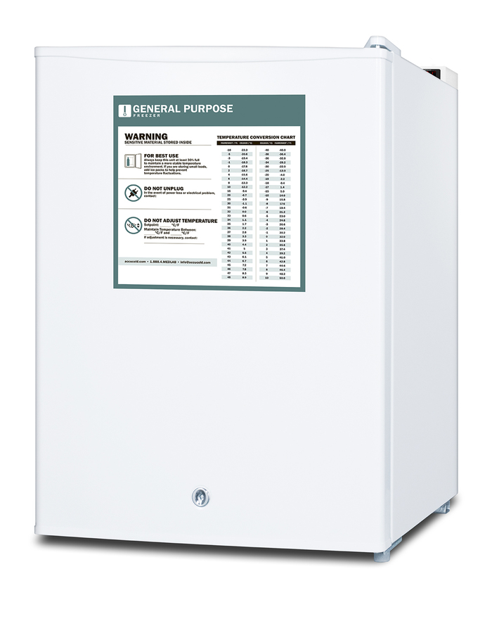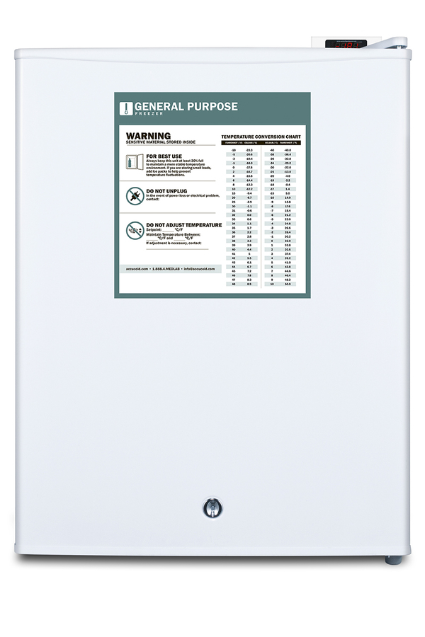 Accucold's series of general purpose freezers include a variety of choices ideal for use in healthcare applications. The FS30LGP is a compact all-freezer designed to offer an improved performance over similarly sized dorm fridges and residential units. This model comes in a white exterior finish with a factory-installed lock on the user-reversible door. A digital thermostat located on the top makes temperature management simple and efficient. This unit is designed for countertop use. Inside, the FS30LGP has a 1.8 cu. ft. capacity providing optimal storage in a compact design. Removable wire shelves provide optimal air circulation ensuring the unit stays cool from top to bottom. A one-piece interior liner makes cleanup easy. This freezer has manual defrost and operates at an average temperature of -20ºC. The FS30LGP is a convenient solution to general purpose cold storage applications. Additional general purpose choices are available as freezers and in undercounter, ADA compliant, and large capacity sizes. Note: Accucold's general purpose series refrigerators are intended for a wide variety of basic storage of non-critical products. For storage of high-value vaccines, life science materials, and medical or clinical biologicals, browse Accucold's Medical & Laboratory or Pharmacy & Vaccine Storage categories, or contact our product specialists to discuss your options at 1-888-4-MED-LAB.