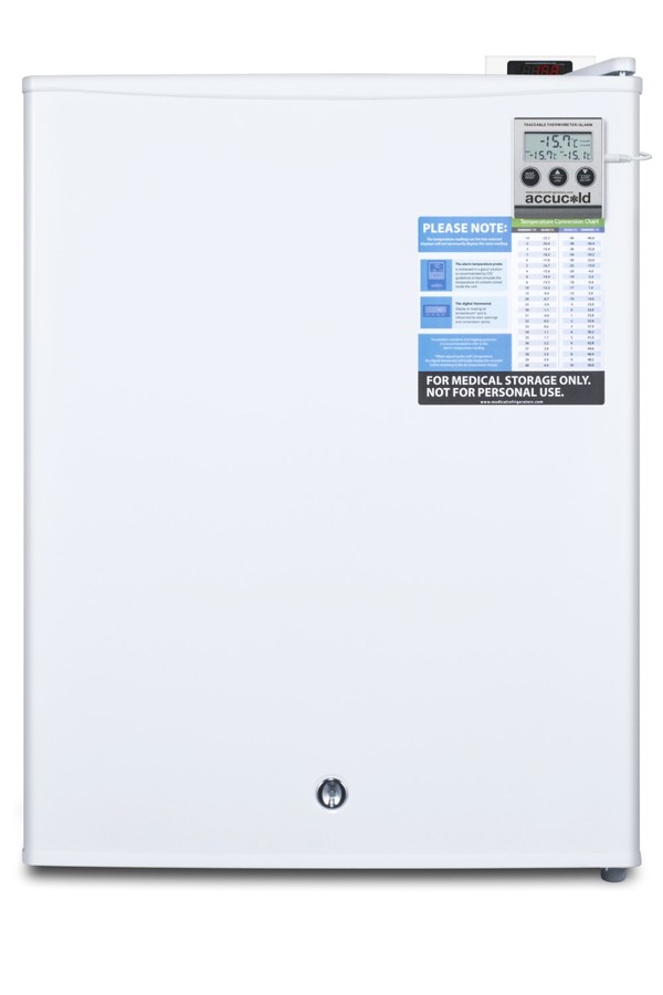 The Accucold® VAC Series freezers are specially designed to store sensitive medical and pharmaceutical materials under the proper conditions, with innovative construction for temperature stability and user-friendly features for added convenience. The FS30LVAC is a compact all-freezer designed to operate at -20º C, the ideal temperature for long-term storage of select sensitive materials. The 1.8 cu.ft. manual defrost interior offers static cooling for stable results. Removable wire shelving allows easy storage options, with a seamless interior liner to simplify cleanup. This unit has a flat door liner as recommended by the CDC. For optimum temperature assurance, the FS30LVAC includes a digital thermostat and a high/low temperature alarm with a NIST calibrated temperature display to the nearest tenth of a degree. A hospital grade cord includes a 'green dot' plug for added safety in high traffic settings, while the self-closing door ensures stored items aren't accidentally exposed to room temperature. This model comes in a white finish and includes a factory installed lock. A pre-installed probe hole/access port allows users to install additional monitoring equipment. The FS30LVAC can be paired with the FF28LWHVAC all-refrigerator for a matching set. These units can also be ordered with more advanced medical features, including a power-out alarm, temperature logger, and more. NOTE: Accucold freezers are purpose-built to the support meeting the current CDC (Centers for Disease Control) guidelines for the storage of vaccines. As referenced in the current Vaccine Storage and Handling Toolkit, these units incorporate several key features for stable operation. For additional temperature assurance, the CDC recommends a calibrated digital data logger (DDL), which can be added with the factory-installed option DL2B or addition of the DL2BKit accessory. Select Accucold products have been tested and certified to the new NSF 456 standard, and are now available for purchase. For additional information, contact our products specialists.