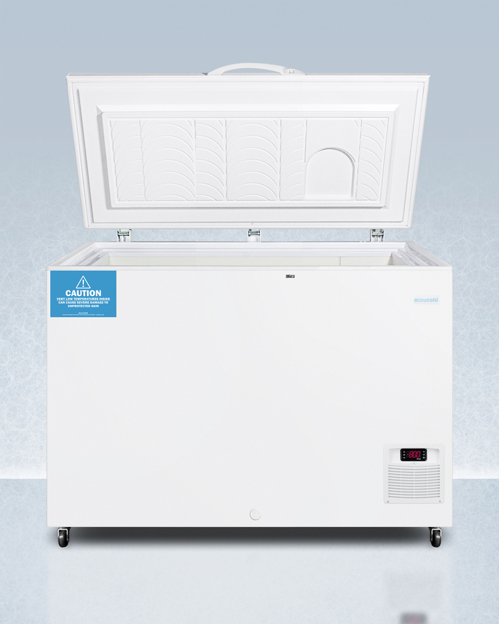 Accucold introduces a new series of ultra low temperature chest freezers designed for reliable storage at -86ºC for laboratory, life science, and other institutional settings. Manufactured for Accucold in Denmark by ELCOLD, model LAB31 offers 11.1 cu.ft. of storage. Extra thick 4 1/2" insulation and static manual defrost operation help to maintain ultra low temperatures suitable for maintaining the integrity of biological samples, industrial materials, laboratory specimens, select vaccines, and other materials with highly specific cold storage requirements. Five inner lids offer added protection by shielding contents when the outer lid is opened. The digital microprocessor controls are mounted in the front for convenient access. This unit has a temperature range that can be set between -50 and -86ºC, with a display viewable in Celsius or Fahrenheit. The thermostat's high/low temperature alarm warns if the interior goes out of the set range. There is also an audible 9V battery-powered alarm in the rear of the unit that will sound in the event of power failure. For added convenience, the LAB31 comes with pre-installed casters, including two front locking wheels to help keep the unit in place. The easy-grip handle includes a factory-installed keyed lock for added security. The LAB31 is UL listed for use in the US and Canada, and also meets ANSI/NSF-7. Additional sizes are available. Browse the full Accucold lineup for more options.