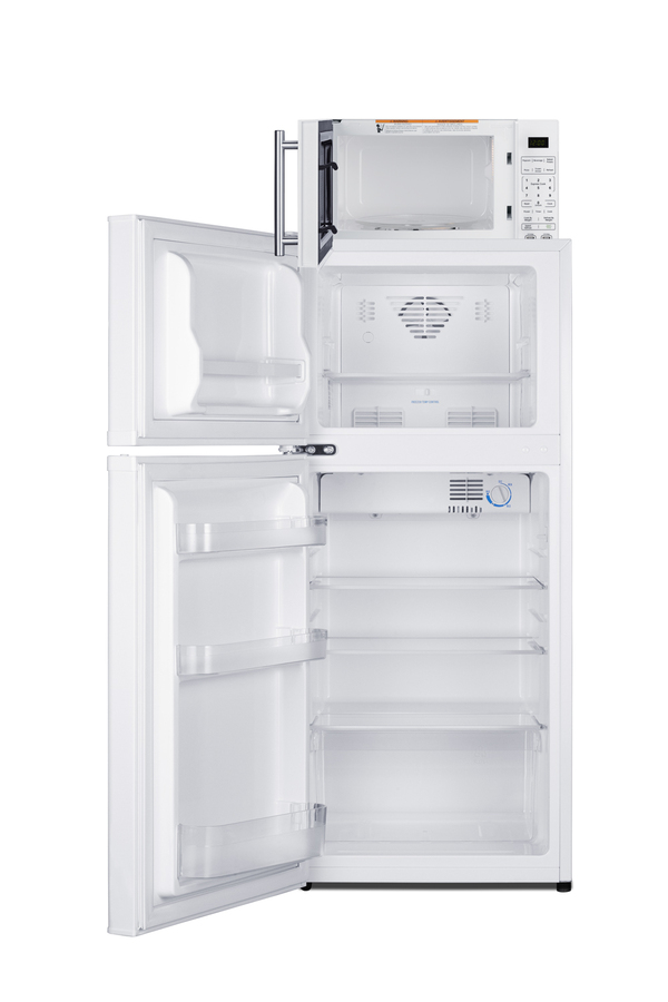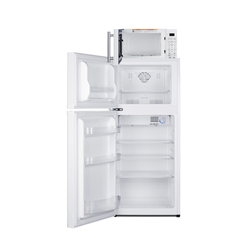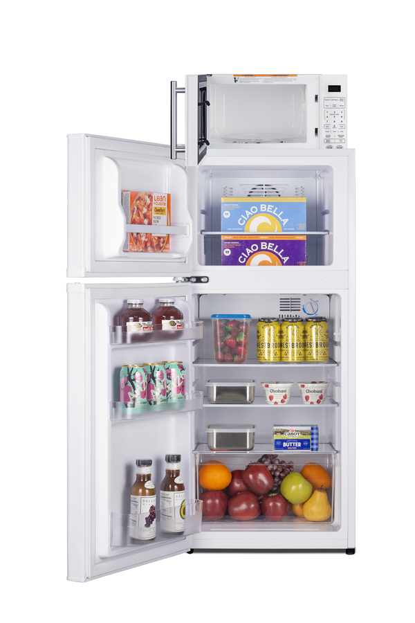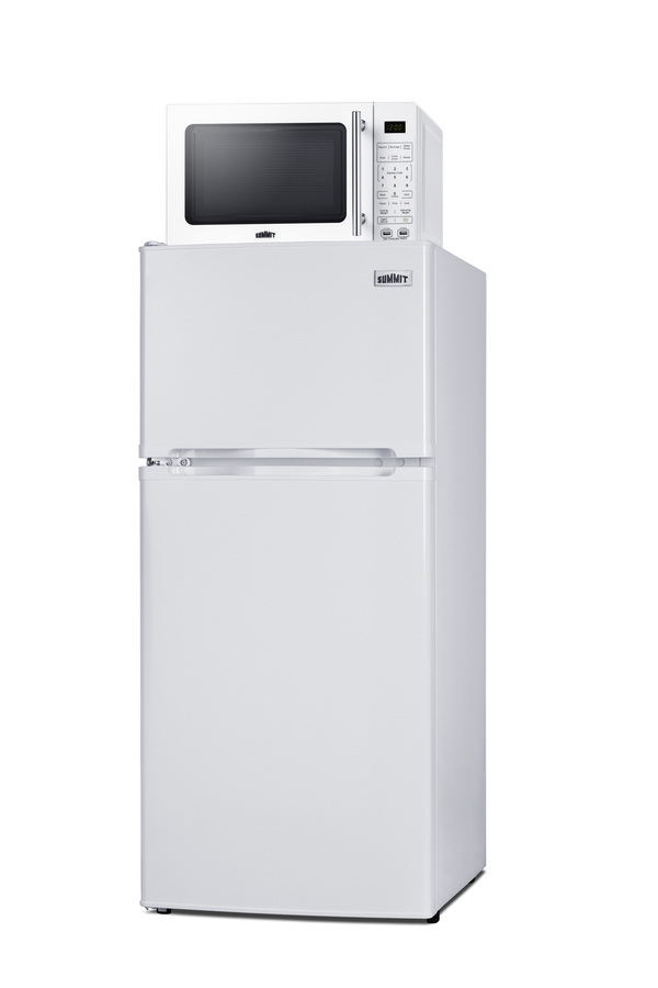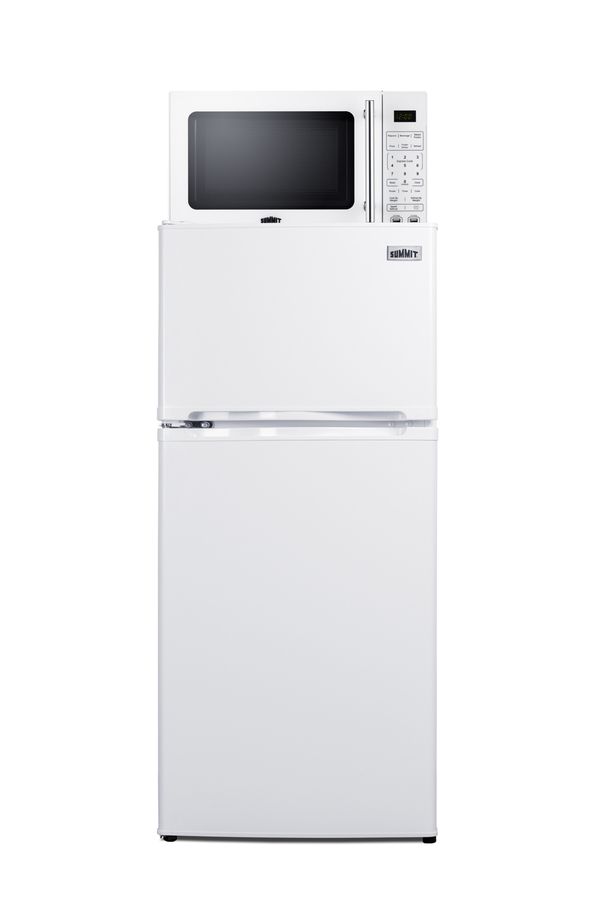 Summit’s innovative MRF series offers combination refrigerator-microwaves with one-plug operation, ideal for hotels and other settings looking to maximize user convenience and save space. Model MRF712WALHD combines a fully featured compact microwave with an ENERGY STAR-certified two-door refrigerator-freezer. The complete unit is sized at 19” wide, with a 43" height to meet ADA guidelines for easy accessibility. The refrigerator-freezer, model FF712WLHD, offers 4.3 cu.ft. of interior storage capacity, one of the largest in this size class of compact refrigerator-freezers. Both refrigerator and freezer sections include adjustable glass shelves and door storage, with the fridge also featuring a clear crisper drawer, and door racks offer convenient storage in the fresh food section. This unit comes in a white finish with a left-hand door swing. The included microwave, model SM904WA, comes in the same classic white finish as the fridge and includes an easy-grab handle in brushed stainless steel to complement the refrigerator. Two USB ports are included to charge mobile devices. The microwave includes a built-in allocator, allowing you to plug the fridge directly into the microwave. Power Note: The allocator will temporarily disable the power of the refrigerator while the microwave is in use, resuming after the cooking cycle is complete in order to protect against power surges. The microwave features a door window and a digital touchpad control panel with one-touch settings for common meals, including frozen food, potatoes, pizza, and popcorn. The display and end-of-cycle alerts can be disabled and muted as needed. We include two brackets that let you set the microwave on top of the refrigerator and gently secure it with adhesive. This unit ships on one pallet in three boxes (refrigerator-freezer, microwave, and our bracket set). With its ENERGY STAR performance and compact fit, the MRF712WALHD is the ideal combo solution for senior living facilities, smaller housing units, offices, dorms, and other space-restricted kitchens. For this unit in a modern black finish, see model MRF713BA. Additional combinations are available in stainless steel, as well as larger and smaller sizes.