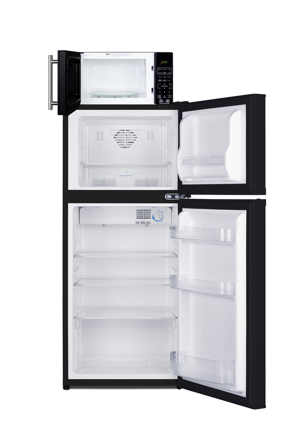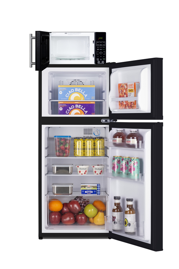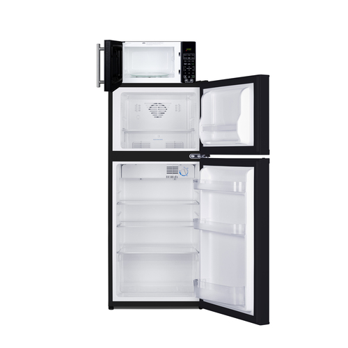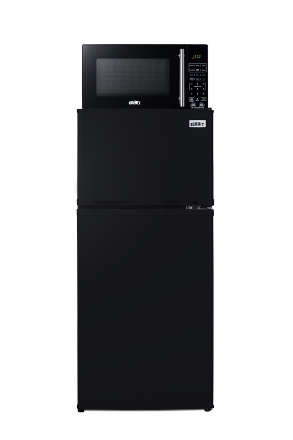 Summit’s innovative MRF series offers combination refrigerator-microwaves with one-plug operation, ideal for hotels and other settings looking to maximize user convenience and save space. Model MRF713BA combines a fully featured compact microwave with an ENERGY STAR-certified two-door refrigerator-freezer. The complete unit is sized at 19” wide, with a 43" height to meet ADA guidelines for easy accessibility. The refrigerator-freezer, model FF713B, offers 4.3 cu.ft. of interior storage capacity, one of the largest in this size class of compact refrigerator-freezers. Both refrigerator and freezer sections include adjustable glass shelves and door storage, with the fridge also featuring a clear crisper drawer, and door racks offer convenient storage in the fresh food section. This unit comes in a jet black finish with reversible doors. The included microwave, model SM903WSA1, comes in the same classic black finish as the fridge and includes an easy-grab handle in brushed stainless steel to complement the refrigerator. Two USB ports are included to charge mobile devices. The microwave includes a built-in allocator, allowing you to plug the fridge directly into the microwave. Power Note: The allocator will temporarily disable the power of the refrigerator while the microwave is in use, resuming after the cooking cycle is complete in order to protect against power surges. The microwave features a door window and a digital touchpad control panel with one-touch settings for common meals, including frozen food, potatoes, pizza, and popcorn. The display and end-of-cycle alerts can be disabled and muted as needed. We include two brackets that let you set the microwave on top of the refrigerator and gently secure it with adhesive. This unit ships on one pallet in three boxes (refrigerator-freezer, microwave, and our bracket set). With its ENERGY STAR performance and compact fit, the MRF713BA is the ideal combo solution for senior living facilities, smaller housing units, offices, dorms, and other space-restricted kitchens. For this unit in a white finish, see model MRF712WA. Additional combinations are available in stainless steel, as well as larger and smaller sizes.