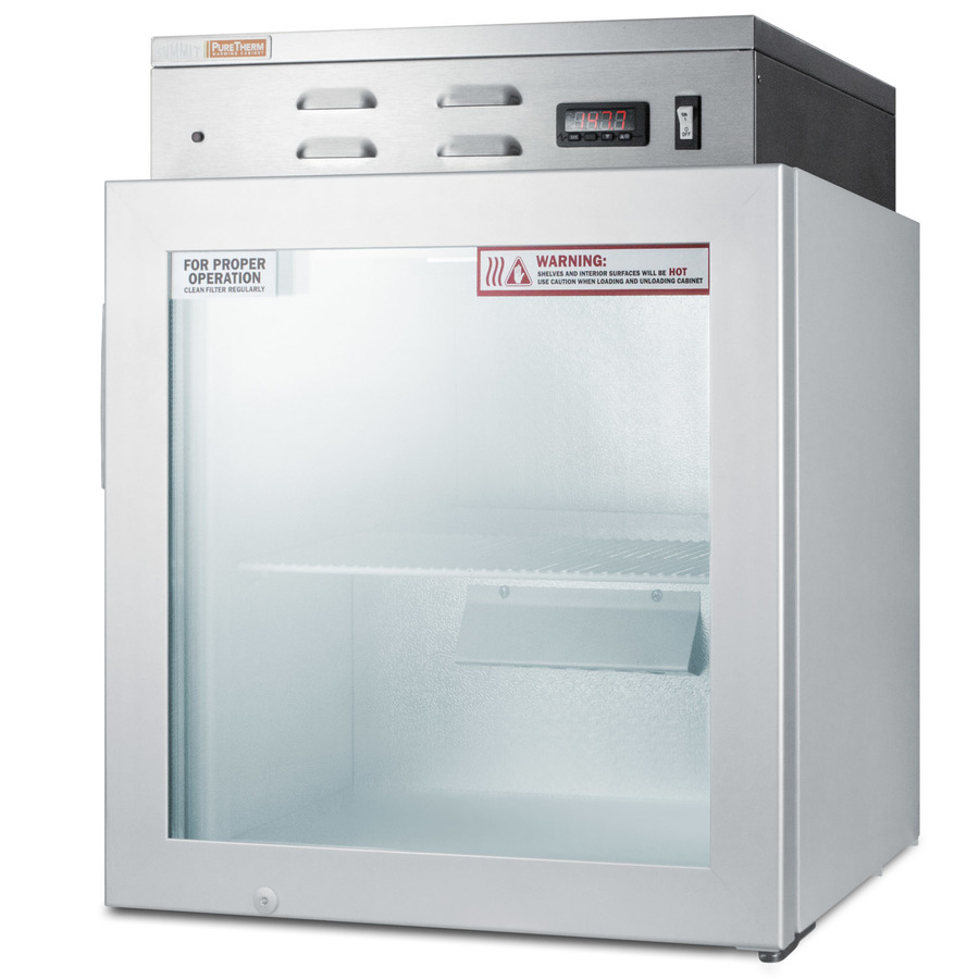 SUMMIT PURETHERM brings value and convenience to warming cabinets, with user-friendly models designed and constructed in the USA. The PHC51G is a single chamber warming cabinet ideal for hospital settings keeping blankets at the proper temperature. Sized for use on top of counters, this unit comes with a gray cabinet finish and self-closing glass door. A factory installed lock offers added security. Inside, the PHC51G is designed to operate between 120º and 150ºF with a foamed-in-place cabinet to ensure efficient insulation. This unit is featured with a digital thermostat that includes a large LED temperature readout to keep you easily informed of the interior conditions. The hammered aluminum interior includes a single shelf for easier storage.