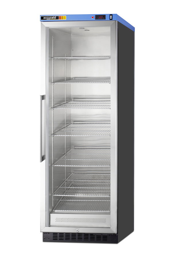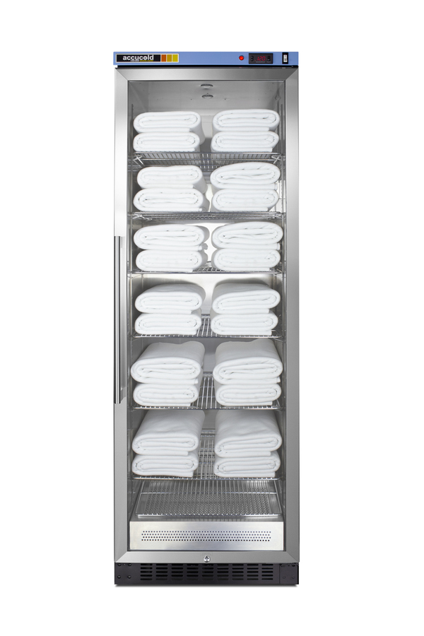 PURETHERM by ACCUCOLD brings value and convenience to warming cabinets, with user-friendly models designed and assembled in the USA. The PTHC155G is a single chamber blanket warmer ideal for hospital settings keeping blankets at the proper temperature. The double pane tempered self-closing glass door ensures your staff can quickly check inventory with a display that goes down to the floor. This unit has a right-hand door swing with a pro style handle for added convenience. No internal fan helps to reduce lint buildup for safer, more efficient operation. Additionally, without fans or moving parts, there is no noise produced for silent operation. The interior walls are constructed from stainless steel to ensure easy cleanup and long-lasting durability. Sized with a 24" footprint, this unit takes up little space but can accommodate up to 12.17 cu.ft of storage. Inside, the PTHC155G is designed to operate between 90º and 140ºF with a foamed-in-place cabinet to ensure efficient insulation. This unit is featured with a digital thermostat that includes a large LED temperature readout. The cantilevered shelving system includes six chrome shelves than be adjusted to virtually any position to best suit your storage needs. The PTHC155G includes a factory installed lock on the stainless steel trimmed door. A hospital grade cord with a 'green dot' plug ensures added safety in high traffic areas. We offer an optional dolly (DollyPHC) specially designed for this unit to allow for easier mobility and cleanup. This model comes with a black cabinet but can be ordered in stainless steel (PTHC155GCSS). With its conveniently slim dimensions and user-friendly features, the PTHC155G is a great way to keep blankets properly cared for in hospitals, medical and physical therapy offices, wellness centers, spas, and other facilities. Additional sizes are available. Visit www.accucold.com/puretherm to explore our complete selection.