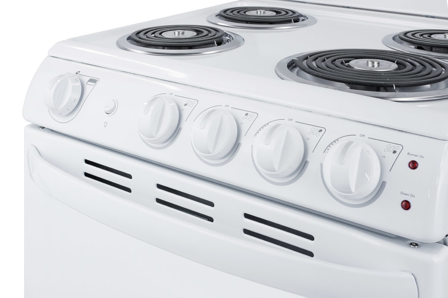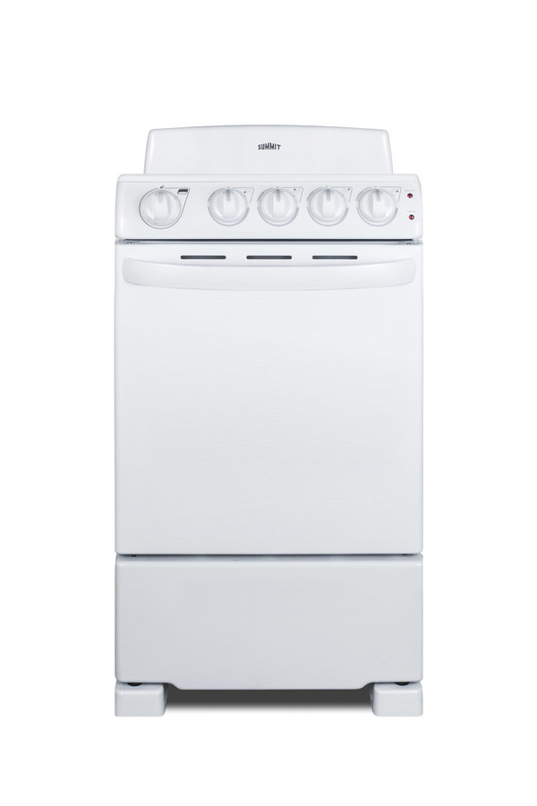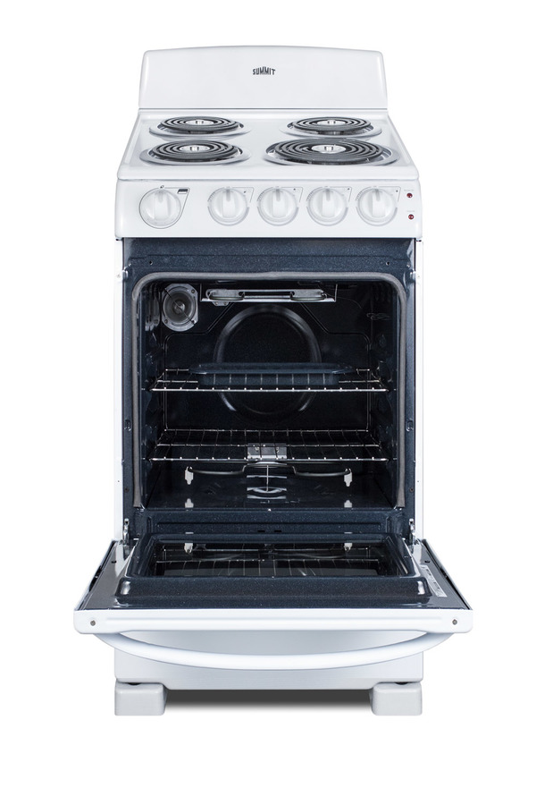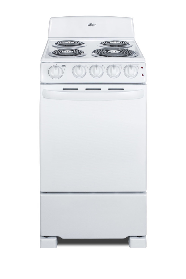 SUMMIT brings outstanding value to small kitchens with fully featured electric ranges in 20" wide fits. Made in North America, the RE203W is a 220V electric range designed for 20" wide spaces. One 8" and three 6" coil burners include removable chrome drip pans for easy cleaning. For added safety, each coil is equipped with a sensor that will automatically cycle the element off if it reaches dangerous flashpoint temperatures. Heating will resume automatically. All cooking controls are located upfront on push-to-turn knobs for safe and easy use. Indicator lights illuminate when the oven is in use. The RE203W features a large 2.3 cu.ft. oven made from durable porcelain, with two adjustable racks and a two-piece broiler pan. The waist-high broiler is conveniently located inside, letting you finish your cooking without transferring contents to an inconvenient drop-down compartment on the floor. The RE203W comes in a white exterior finish with color-matched knobs and handle. With its slim fit and quality design, this unit is the ideal choice for space-challenged kitchens on a budget. For more options, including smooth-top ranges and 24" wide choices, browse our website. Note: this item replaces the RE201W.