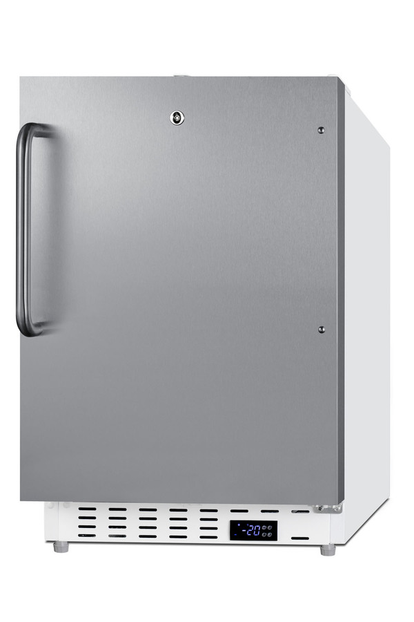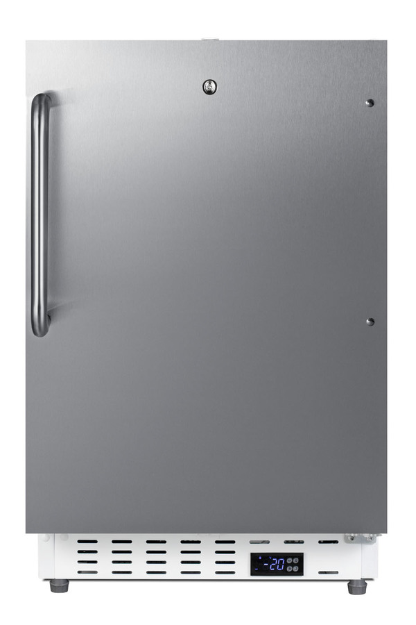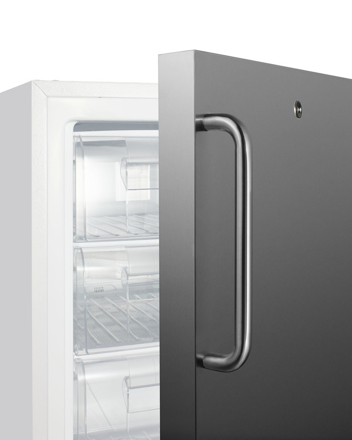 Summit Commercial manufactures a variety of refrigerator and freezer choices for smaller foodservice spaces, with slim-fitting options for undercounter use. Model SCF505SSTBADA is a commercial all-freezer sized at just under 20" wide and 32" high for installation under lower ADA compliant counters. Its front-breathing design and fully finished cabinet allow built-in or freestanding use for versatile placement. This model has a textured white cabinet and 304 grade stainless steel wrapped reversible door with a pro style towel bar handle. A factory-installed lock is located towards the top of the door, ensuring more comfortable access behind the bar. Easy digital controls are located in the kickplate. The temperature can be managed in Fahrenheit or Celsius and is designed to operate between -25° and -15°C. Inside, this freezer includes removable pull-out drawers on fixed wire shelving, with plastic fronts that help to protect contents from warmer ambient temperatures when the door is opened. This unit utilizes static manual defrost cooling for improved temperature stability. Audible open door and high/low temperature alarms help ensure stored contents are properly cooled. These alarms can also be disabled if preferred. The SCF505SSTBADA is ETL-S listed to NSF-7 commercial standards and features hydrocarbon refrigerant for a greener cooling system that meets CARB regulations. To create a matching set, pair with the SCR504SSTBADA all-refrigerator. Additional commercial refrigeration choices are available in more sizes and sizes. Browse the full Summit lineup for shallow depth back bar coolers, commercial wine cellars, clear icemakers, reach-in refrigeration, and much more.