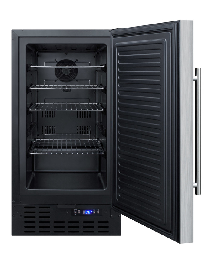 SUMMIT brings true convenience to small kitchen spaces with the SCFF1842CSSADA, an 18" wide fully frost-free all-freezer designed for use under lower ADA compliant counters. The 32" high SCFF1842CSSADA is front-breathing for built-in use under counters, but also features a fully finished cabinet to allow freestanding use. This model has stainless steel wrapped exterior. The reversible door includes a factory installed lock and professional handle. Inside, the SCFF1842CSSADA is fully frost-free to minimize user maintenance, with slide-out chrome shelves that can be adjusted to accommodate a variety of items in the 2.7 cu.ft. interior. This unit includes a digital thermostat for easy and intuitive temperature control. With a uniquely slim size and user-friendly features, the SCFF1842CSSADA is the ideal freezer for space-challenged spaces. This model meets UL-471 standards and is ETL-S listed to NSF-7 for use in commercial environments.