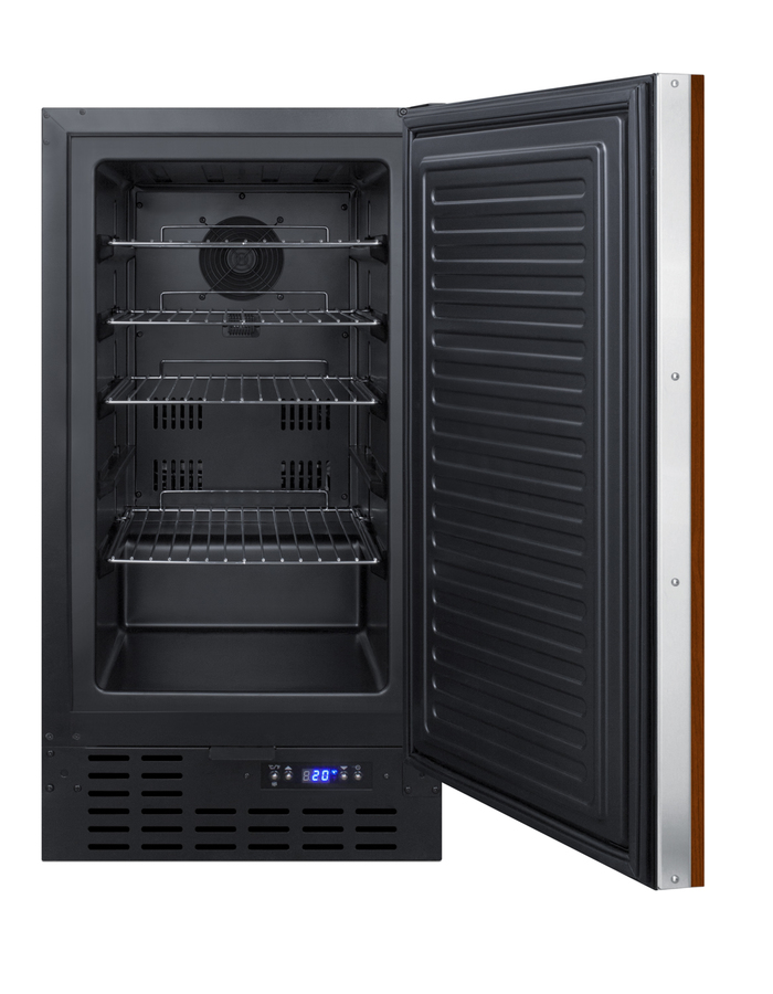 SUMMIT brings true convenience to small kitchen spaces with the SCFF1842IFADA, an 18" wide fully frost-free all-freezer designed for use under lower ADA compliant counters. The 32" high SCFF1842IFADA is front-breathing for built-in use under counters, but also features a fully finished jet black cabinet to allow freestanding use. The door includes an integrated stainless steel frame designed to accept full overlay panels for a custom look. Users provide their own handle. Inside, the SCFF1842IFADA is fully frost-free to minimize user maintenance, with slide-out chrome shelves that can be adjusted to accommodate a variety of items in the 2.7 cu.ft. interior. This unit includes a digital thermostat for easy and intuitive temperature control. With a uniquely slim size and user-friendly features, the SCFF1842IFADA is the ideal freezer for space-challenged spaces. This model meets UL-471 standards and is ETL-S listed to NSF-7 for use in commercial environments.