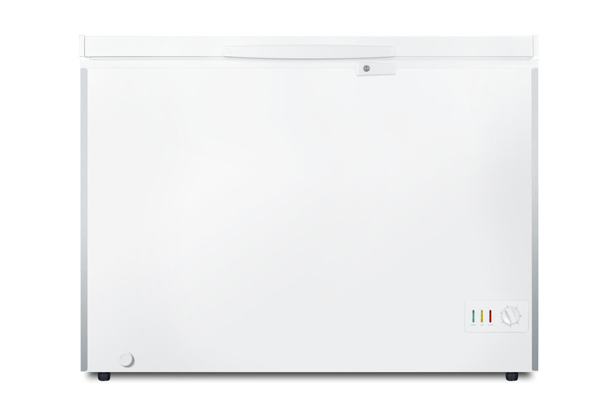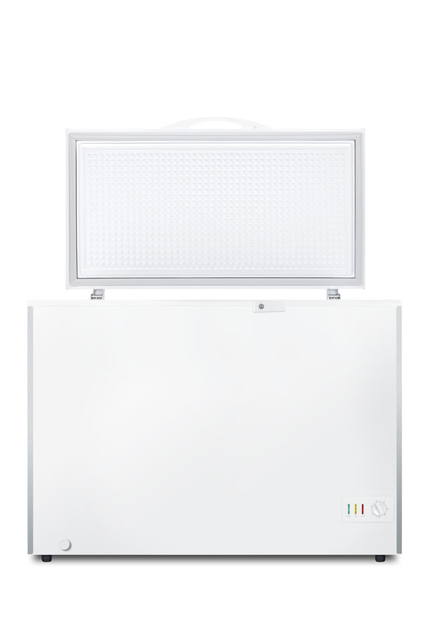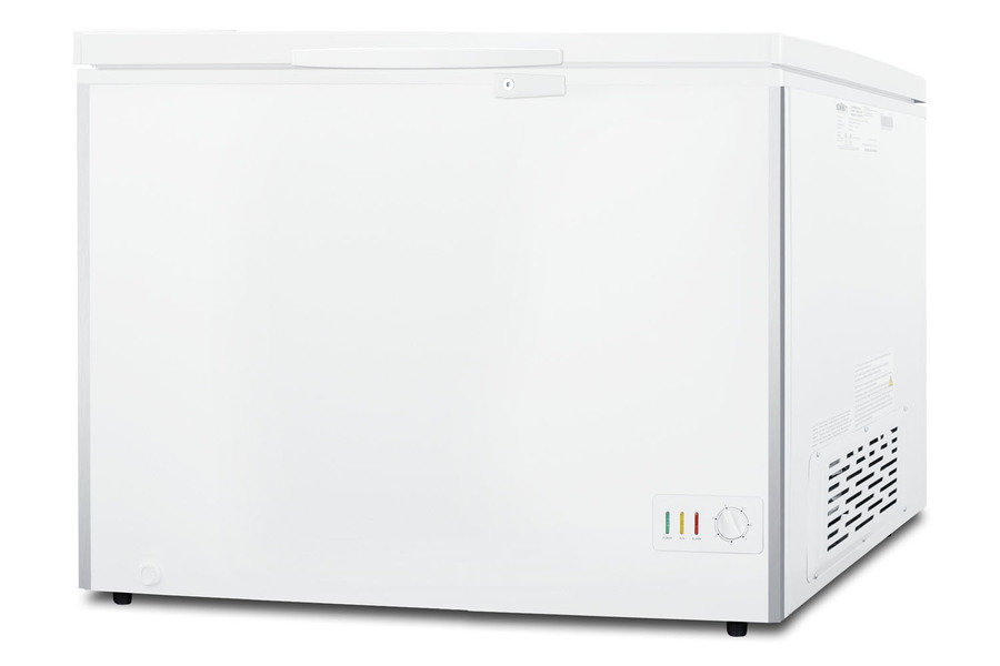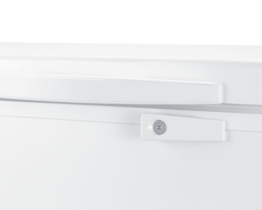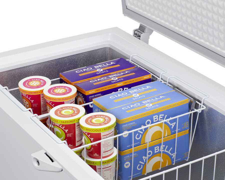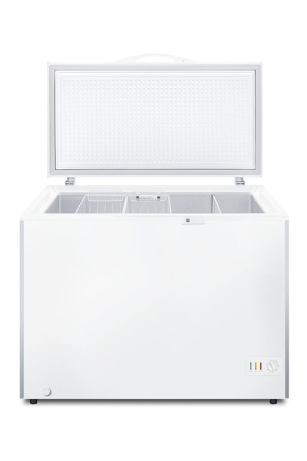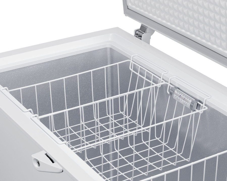 SUMMIT COMMERCIAL offers a quality selection of manual defrost chest freezers designed for a variety of storage applications in commercial establishments. The SCFM103 is ETL-S listed to NSF-7 standards for commercial use. The large interior offers 10 cu.ft. of storage capacity. The lid features counterbalanced hinges to stay open, making it easier to load and unload. We include a handle and keyed lock with two keys for optional user installation. This freezer features two pre-installed stainless steel corner protectors to help shield the unit's sides in busy environments. Inside, the SCFM103 features a hammered aluminum interior for lasting durability in commercial settings. Two sliding wire baskets offer easy storage and a divider lets you separate items stored on the right side. This unit utilizes static manual defrost cooling, with a defrost drain located in the front. The cord features a right angle plug for an easier fit into your outlet. The dial thermostat is located in the front corner, with a power indicator and an alarm light that will illuminate if the unit is operating warmer than -11ºC (12.2ºF). We include a removable thermometer that conveniently hooks onto a basket for a quick temperature reference. In addition to this unit, SUMMIT COMMERICAL offers additional sizes of commercially listed manual defrost freezers, as well as frost-free choices and low temperature freezers all approved to NSF commercial standards. Browse our full lineup to find the right storage solution for your needs.
