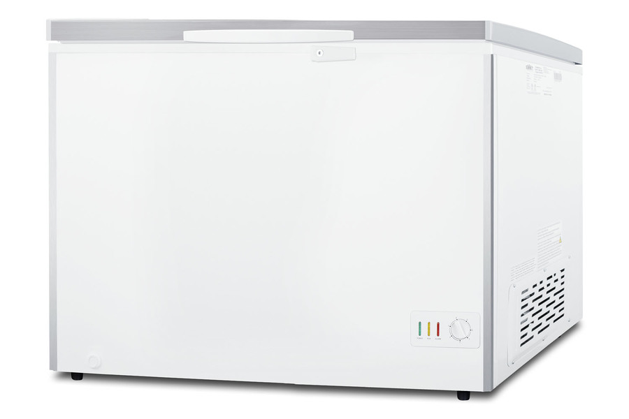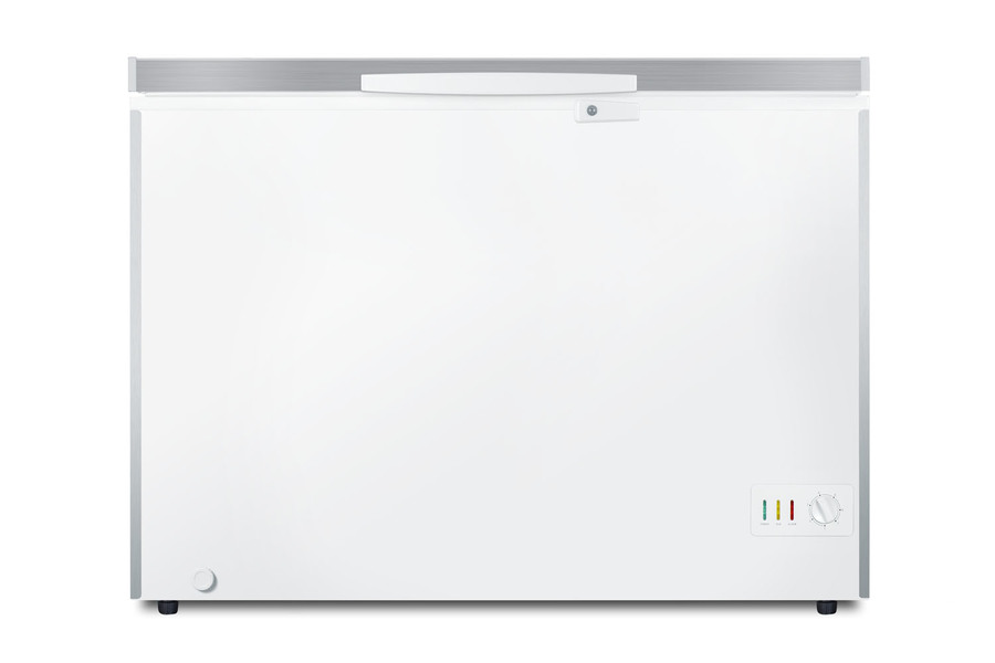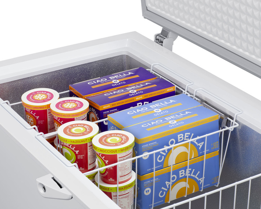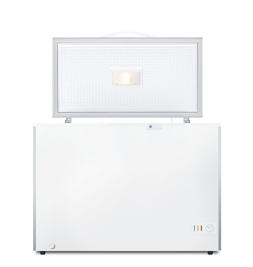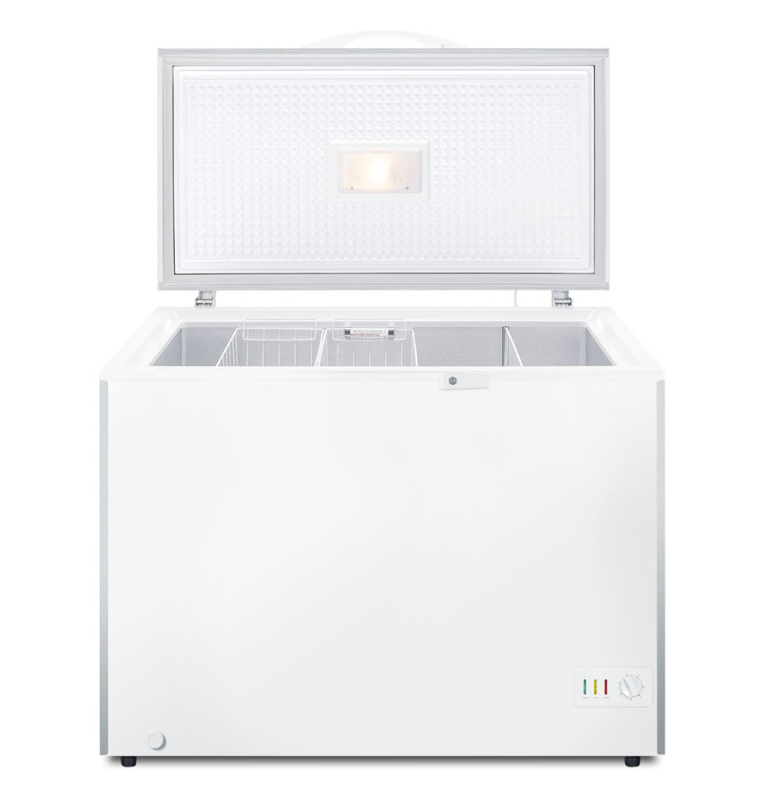 SUMMIT COMMERCIAL offers a quality selection of manual defrost chest freezers designed for a variety of storage applications in commercial establishments. The SCFM103SL is ETL-S listed to NSF-7 standards for commercial use. The large interior offers 10 cu.ft. of storage capacity. The lid offers the look of stainless steel, with counterbalanced hinges to help stay open when loading the interior. We include a handle and keyed lock with two keys for optional user installation. This freezer features two pre-installed stainless steel corner protectors to help shield the unit's sides in busy environments. Inside, the SCFM103SL features a hammered aluminum interior for lasting durability in commercial settings. The lid includes an LED light for better visibility. Two sliding wire baskets offer easy storage and a divider lets you separate items stored on the right side. This unit utilizes static manual defrost cooling, with a defrost drain located in the front. The cord features a right angle plug for an easier fit into your outlet. The dial thermostat is located in the front corner, with a power indicator and an alarm light that will illuminate if the unit is operating warmer than -11ºC (12.2ºF). We include a removable thermometer that conveniently hooks onto a basket for a quick temperature reference. In addition to this unit, SUMMIT COMMERICAL offers additional sizes of commercially listed manual defrost freezers, as well as frost-free choices and low temperature freezers all approved to NSF commercial standards. Browse our full lineup to find the right storage solution for your needs.