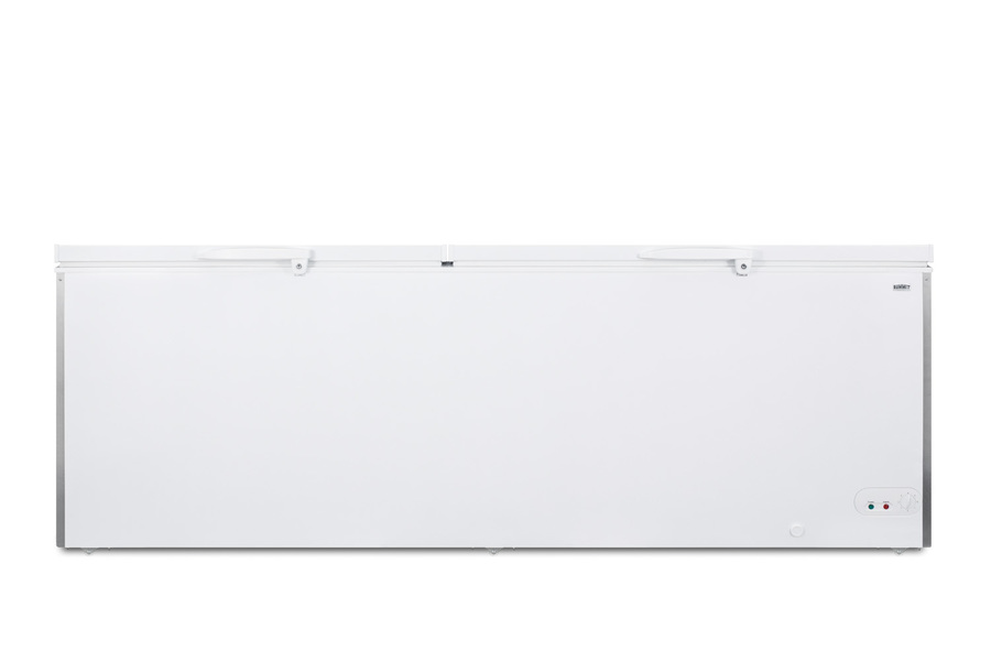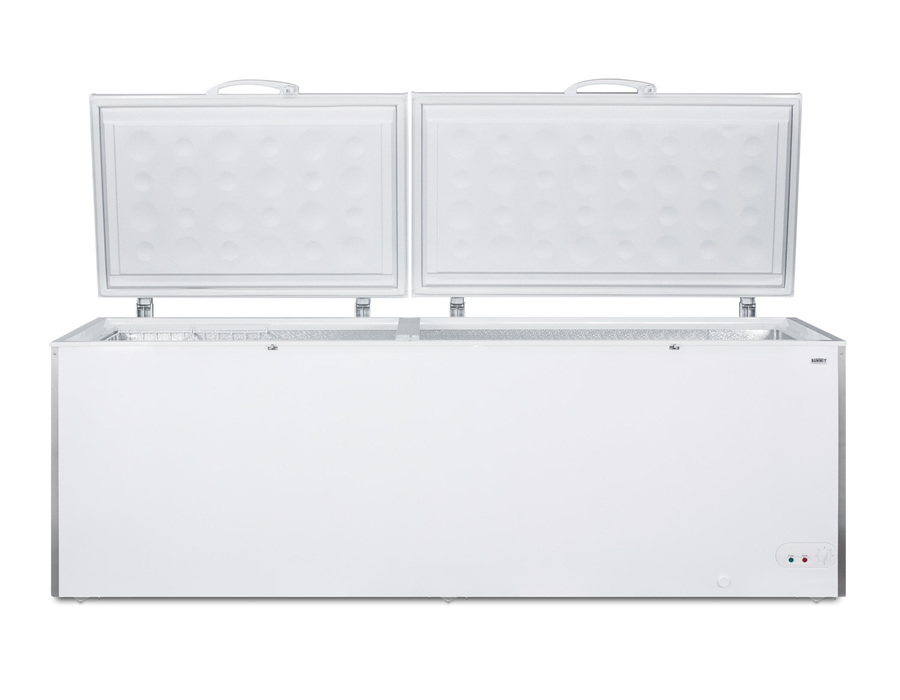 SUMMIT COMMERCIAL offers a quality selection of manual defrost chest freezers designed for a variety of storage applications in commercial establishments. The SCFM252W is UL-S listed to NSF-7 standards for commercial use. It comes in a white finish with stainless steel corner protectors factory installed on the exterior to ensure protection in high traffic areas. Sized at over 91" wide, the SCFM252W offers a generous 26.66 cu.ft. of storage capacity. This unit features two lift-up lids with counterbalanced hinges for safer loading. The lids include easy-to-grab handles and factory-installed keyed locks. Six small wheels allow you to reposition the freezer with ease. Inside, the SCFM252W features a hammered aluminum interior for lasting durability in commercial settings. We include two sliding wire baskets for easy storage. This unit utilizes static manual defrost cooling, with a defrost drain conveniently located in the front. The dial thermostat offers intuitive temperature management and a visual alarm lights up if the temperature rises above -11ºC. In addition to this unit, SUMMIT COMMERICAL offers additional sizes of commercially listed manual defrost freezers, as well as frost-free choices and low temperature freezers all approved to NSF commercial standards.