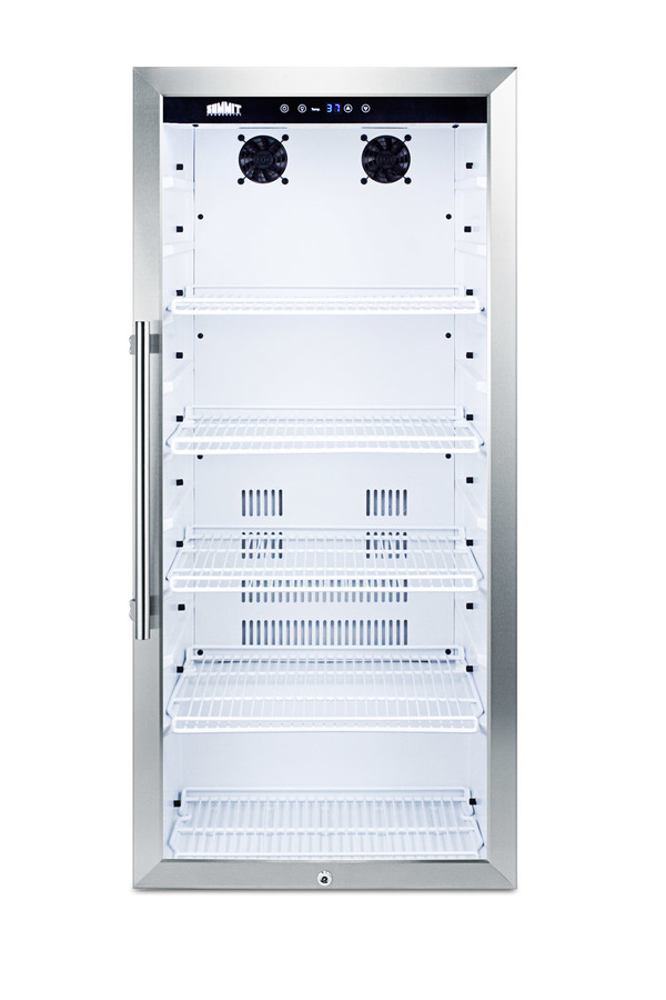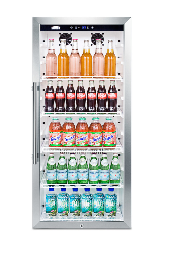 Summit Commercial offers a quality line of slim-fitting beverage merchandisers designed for long-lasting use in busy commercial settings. Sized with a unique 21 1/4" W x 22 1/2" D footprint, the SCR1006CSS offers a full 9 cu.ft. storage capacity with a full display from top to bottom. The user-reversible double pane tempered glass door includes a factory installed lock and attractive stainless steel trim. This unit has a fully wrapped stainless steel cabinet for a professional look with lasting Inside, the SCR1006CSS utilizes automatic defrost for easy maintenance, with fan-forced cooling that ensures the temperature is evenly distributed from top to bottom. A digital thermostat allows for precise temperature control and offers a readout in Celsius or Fahrenheit. Interior LED lighting keeps all items in view and includes an on/off button on the exterior control panel for added convenience. Five adjustable wire shelves allow users to store a variety of bottles and cans, with nine glide positions to adjust the size as needed. With its slim dimensions and user-friendly, features, the SCR1006CSS is a great choice for commercial establishments looking to maximize sales of stored beverages. This unit is ETL-S listed to NSF-7 commercial standards.