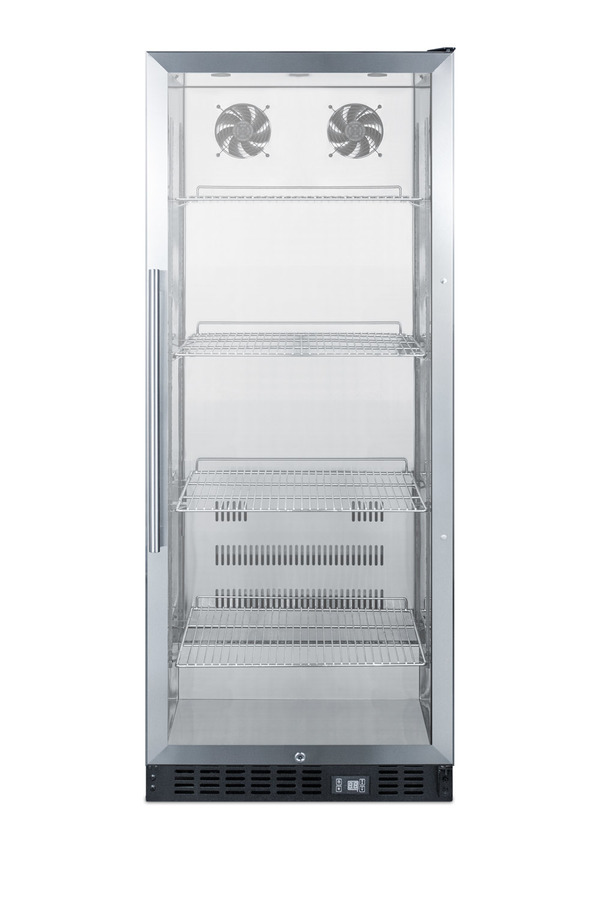 Summit's commercially approved beverage merchandisers are designed for durable service, convenient use, and attractive presentation. The SCR1156 is an upright beverage center conveniently sized with a slim 24 inch footprint. The stainless steel trimmed glass door provides a full view of storage down to the floor, with recessed LED lighting to ensure an attractive and efficient presentation. The door comes in a right hand door swing and features a self-closing design to help protect stored items in commercial settings where customers may not take the time to ensure a tight seal. A factory installed lock offers additional security. This unit has a front-breathing cooling system that allows built-in installation, and a fully finished exterior that also enables freestanding use. Inside, the SCR1156 utilizes frost-free operation for minimum user maintenance. The interior walls are made from stainless steel for improved durability and sanitation. The cantilevered shelving system allows you to easily adjust your storage to accommodate virtually any size. The digital control panel ensures easy temperature management with the readout can be viewed in Celsius or Fahrenheit. Additional features include an audible high temperature alarm, open door alarm, temperature memory function, and sabbath mode setting. The SCR1156 is ETL-S listed to NSF-7 standards and is ENERGY STAR certified as a commercial beverage center. Additional choices are available in larger sizes. Browse Summit's commercial product line for more.