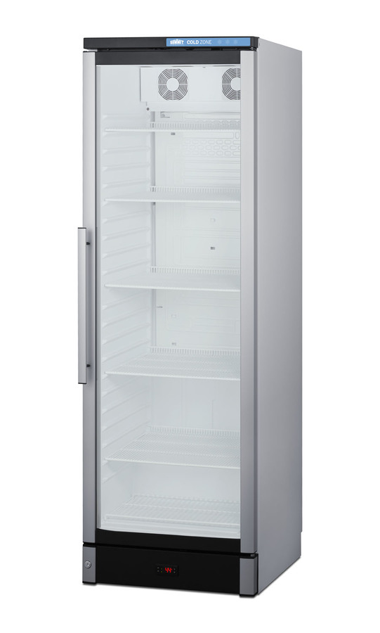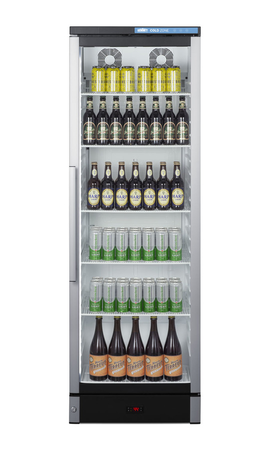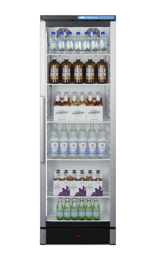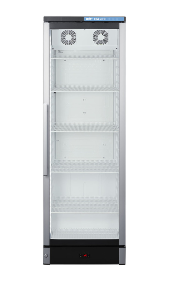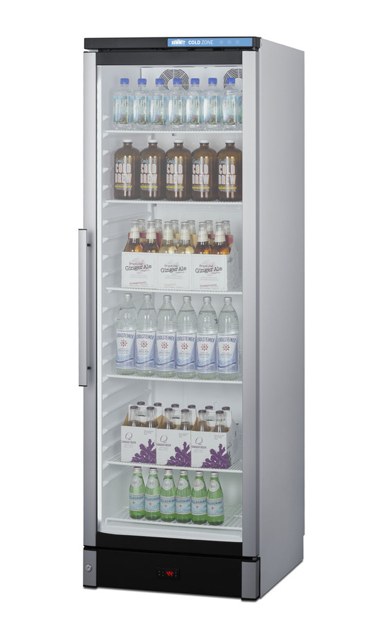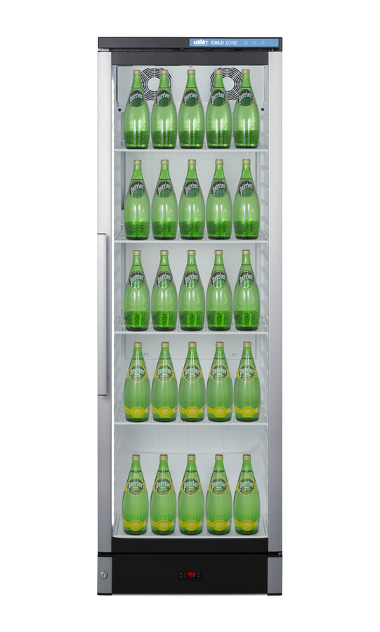 Summit Commercial manufactures a full selection of slim-fitting European beverage centers designed for durable service, convenient use, and attractive presentation. Made in Denmark, model SCR1301 is a 24" wide 12.4 cu.ft. upright beverage merchandiser sized with a space-saving 25 1/4" depth. The double pane tempered glass door includes built-in LED lighting to create an attractive and energy efficient presentation of stored items, helping to promote impulse buys. A factory-installed lock allows users to secure the door as needed. Digital controls ensure easy and intuitive operation. Inside, the SCR1301 features a bright white interior for full product visibility. Five adjustable wire shelves let you rearrange your storage to accommodate a variety of sizes. Each shelf has a generous 79 lb. storage tolerance. We include one additional shelf to raise items off the floor. The automatic defrost system with a cold wall interior helps to keep beverages cold and minimize user maintenance, while powerful fan-forced cooling helps to evenly distribute airflow and promote fast temperature recovery in busy commercial environments. The SCR1301 is ETL-S listed to NSF-7 commercial standards and utilizes environmentally-friendly hydrocarbon refrigerant to comply with CARB guidelines. NOTE: this unit ships with a right hand door swing. For a left hand version by special order, add option "LHD" or see model SCR1301LHD.