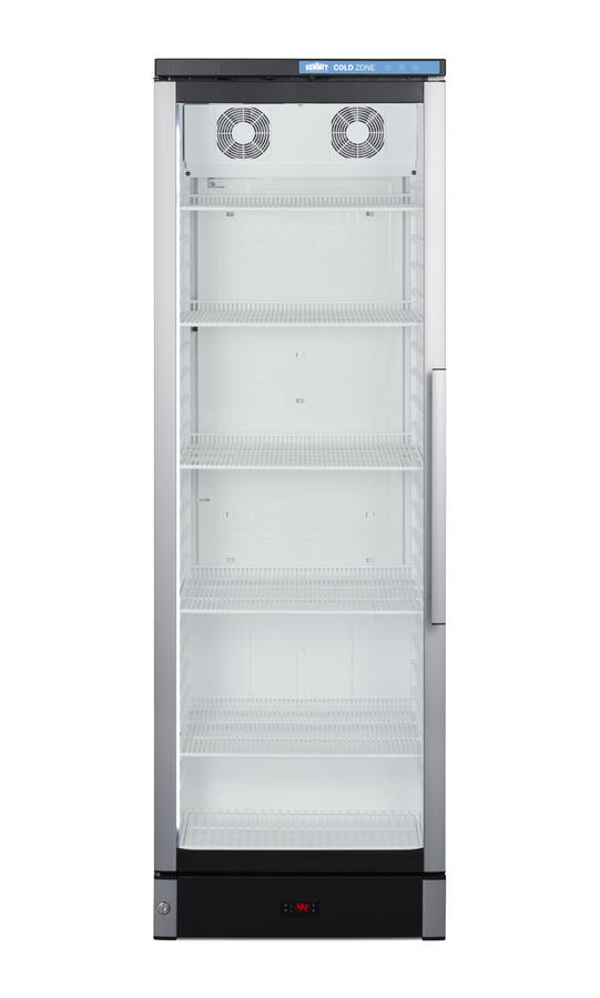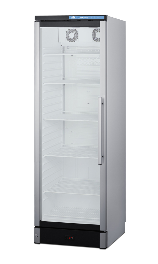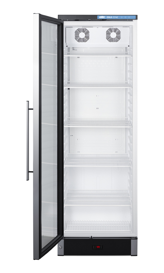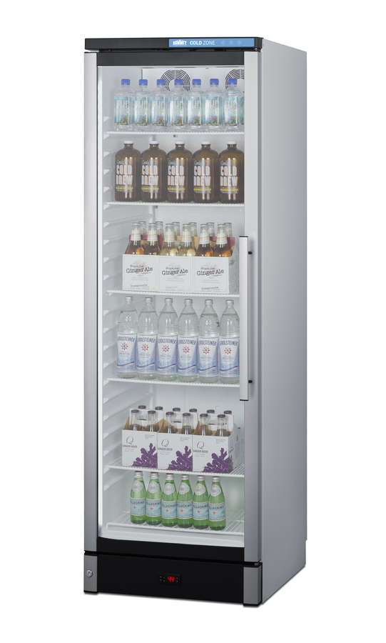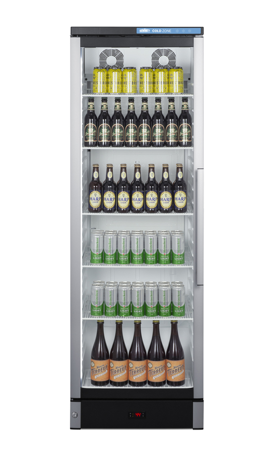 Summit Commercial manufactures a full selection of slim-fitting European beverage centers designed for durable service, convenient use, and attractive presentation. Made in Denmark, model SCR1301LHD is a 24" wide 12.4 cu.ft. upright beverage merchandiser sized with a space-saving 25 1/4" depth. The double pane tempered glass door includes built-in LED lighting to create an attractive and energy efficient presentation of stored items, helping to promote impulse buys. A factory-installed lock allows users to secure the door as needed. Digital controls ensure easy and intuitive operation. This unit ships with a left hand door swing. Inside, the SCR1301LHD features a bright white interior for full product visibility. Five adjustable wire shelves let you rearrange your storage to accommodate a variety of sizes. Each shelf has a generous 79 lb. storage tolerance. We include one additional shelf to raise items off the floor. The automatic defrost system with a cold wall interior helps to keep beverages cold and minimize user maintenance, while powerful fan-forced cooling helps to evenly distribute airflow and promote fast temperature recovery in busy commercial environments. The SCR1301LHD is ETL-S listed to NSF-7 commercial standards and utilizes environmentally-friendly hydrocarbon refrigerant to comply with CARB guidelines.