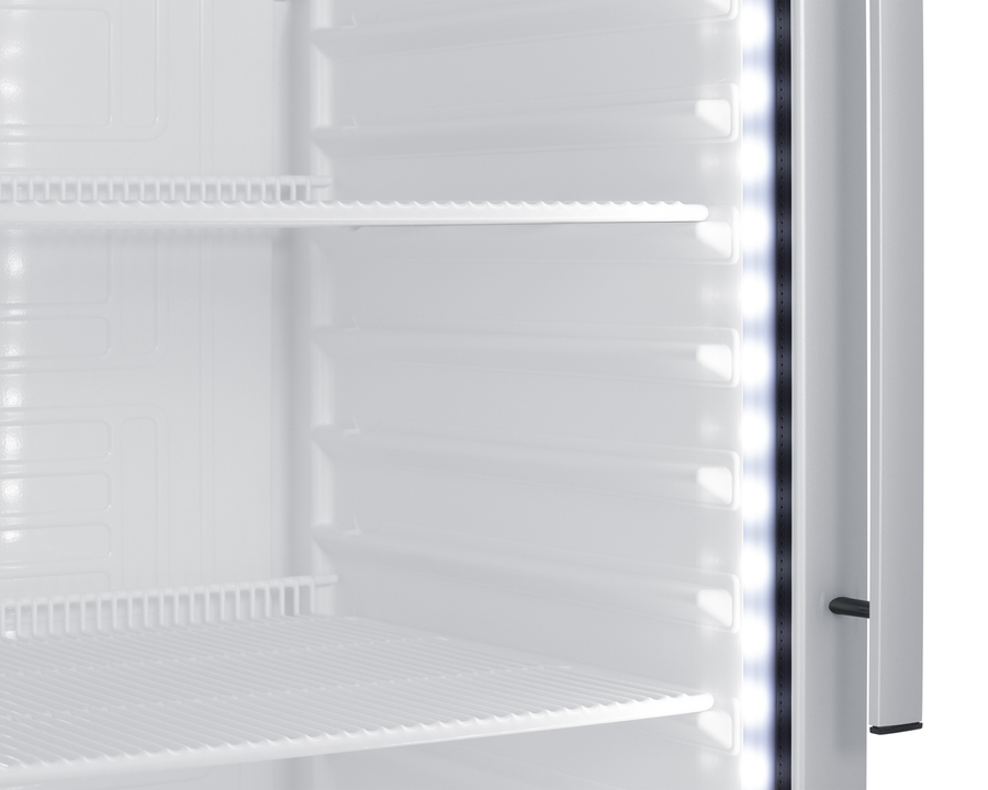 Door panel features a full-length LED strip to provide an attractive and energy efficient presentation