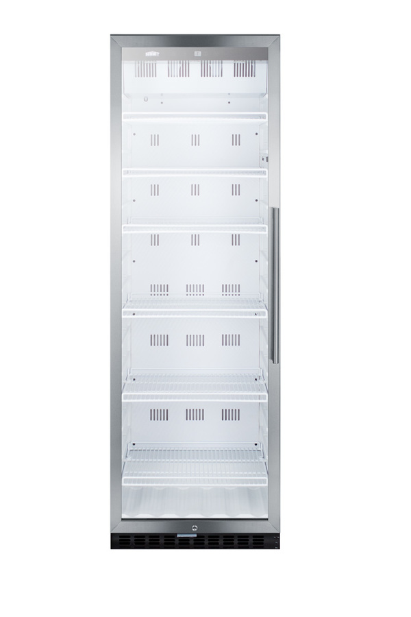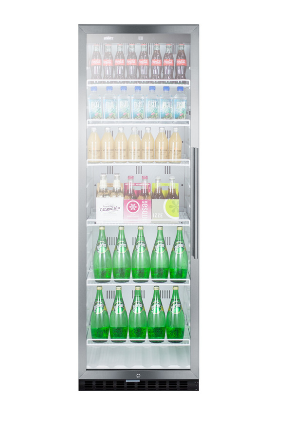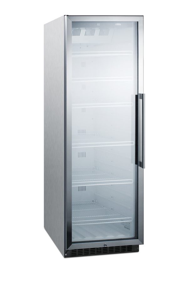 SUMMIT's commercially approved beverage merchandisers are designed for durable service, convenient use, and attractive presentation. SUMMIT SCR1400WLHCSS offers 12.6 cu.ft. of storage space in a slim-fitting footprint just under 24". Bottles and cans can be stored on six heavy duty wire shelves, with fifteen glide options to accommodate different sizes. LED lighting offers full illumination of stored products and a digital thermostat makes temperature control as simple as touching a button. The readout can be viewed in Celsius or Fahrenheit. The frost-free SCR1400WLHCSS features a tempered heat-safe glass door trimmed in stainless steel, with a keyed lock for added security. The stainless steel trimmed glass door includes a pro style handle to complete the modern look, with a self-closing mechanism to ensure items aren't accidentally exposed to warm air. This model has a stainless steel wrapped cabinet and a right angle plug for an easier fit. This unit has a front-breathing cooling system that allows built-in installation, and a fully finished exterior that also enables freestanding use. It meets UL-471 commercial standards and is ETL-S listed to NSF standards for use in any commercial foodservice establishment. This unit has a left hand door swing. For a right hand version, see the SCR1400WCSS. NOTE: This is an indoor refrigerator and is not designed for use in the outdoors.