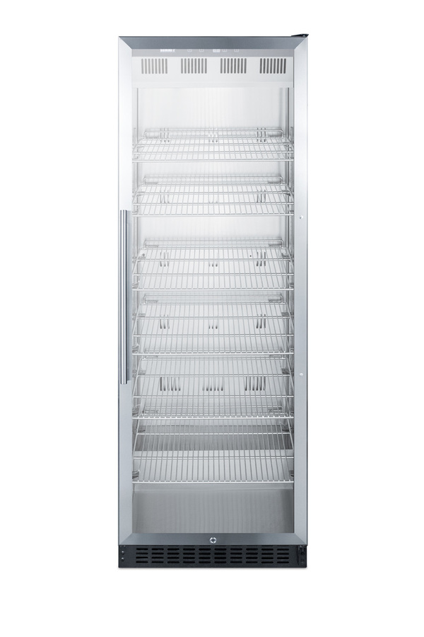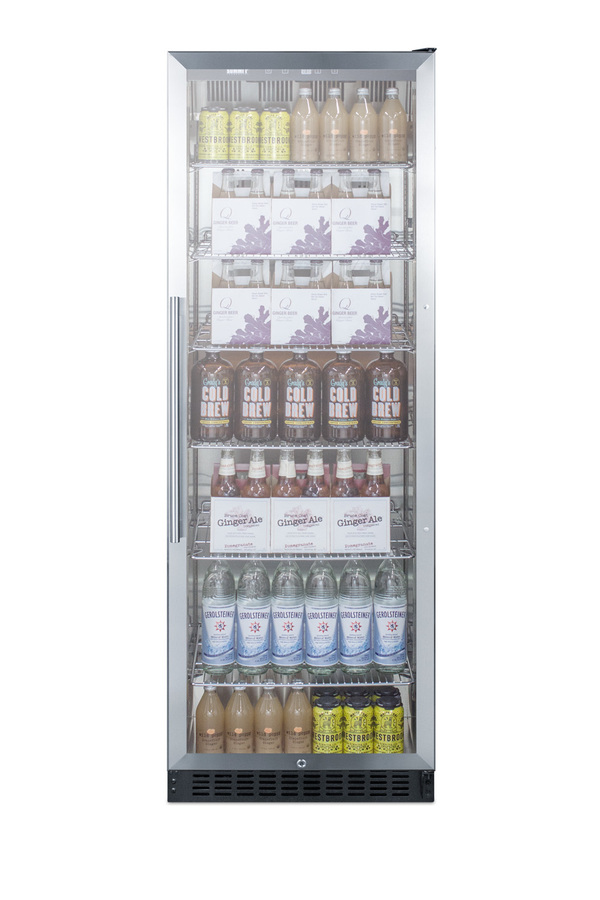 Summit's commercially approved beverage merchandisers are designed for durable service, convenient use, and attractive presentation. The SCR1401 is an upright beverage center conveniently sized with a slim 24 inch footprint. The stainless steel trimmed glass door provides a full view of storage down to the floor, with recessed LED lighting to ensure an attractive and efficient presentation. The door comes in a right hand door swing and features a self-closing design to help protect stored items in commercial settings where customers may not take the time to ensure a tight seal. A factory installed lock offers additional security. This unit has a front-breathing cooling system that allows built-in installation, and a fully finished exterior that also enables freestanding use. Inside, the SCR1401 utilizes frost-free operation for minimum user maintenance. The interior walls are made from stainless steel for improved durability and sanitation. The cantilevered shelving system allows you to easily adjust your storage to accommodate virtually any size. The digital control panel is conveniently located towards the top, allowing staff to adjust the temperature without bending to the floor. The readout can be viewed in Celsius or Fahrenheit. Additional features include an audible high temperature alarm, open door alarm, temperature memory function, and sabbath mode setting. The SCR1401 is ETL-S listed to NSF-7 standards for use in commercial settings. Similar choices are available in lower heights for more space-challenged areas. Browse Summit's commercial product line for more.