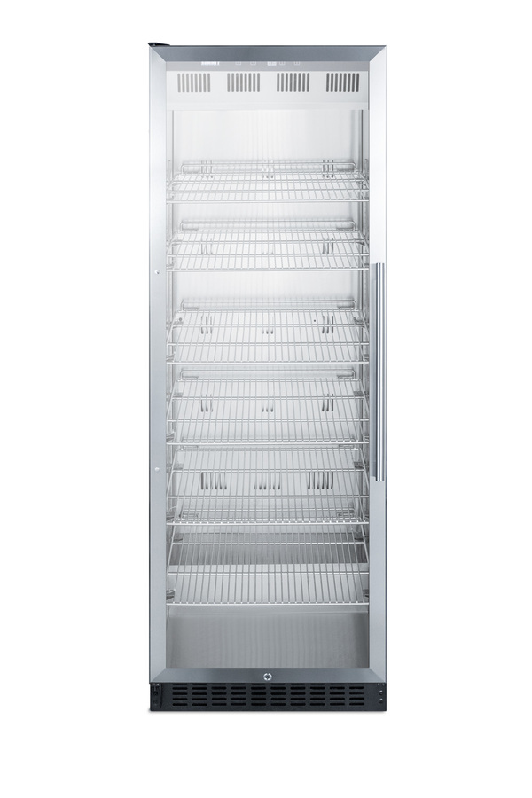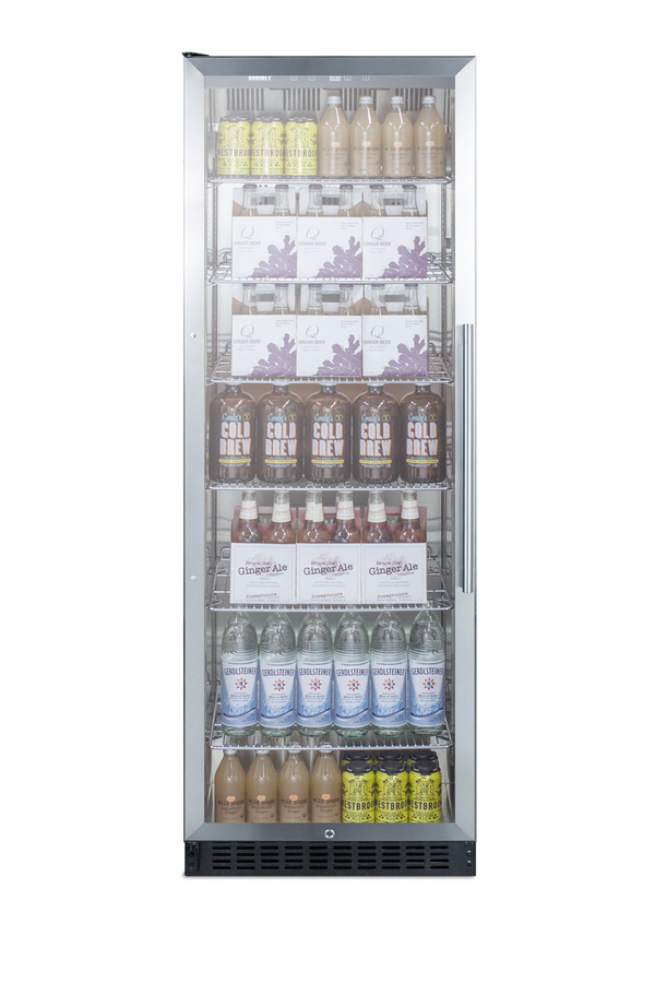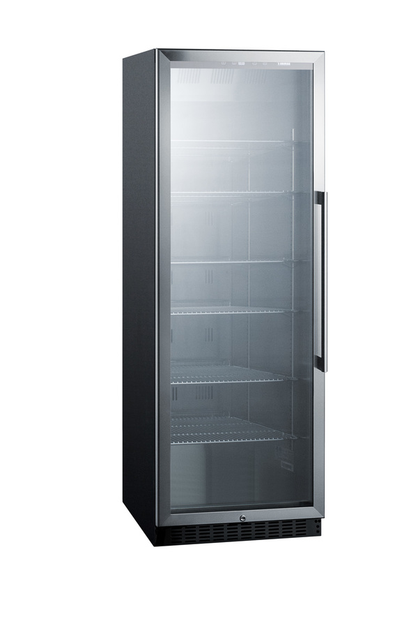 Summit's commercially approved beverage merchandisers are designed for durable service, convenient use, and attractive presentation. The SCR1401LH is an upright beverage center conveniently sized with a slim 24 inch footprint. The stainless steel trimmed glass door provides a full view of storage down to the floor, with recessed LED lighting to ensure an attractive and efficient presentation. The door comes in a left hand door swing and features a self-closing design to help protect stored items in commercial settings where customers may not take the time to ensure a tight seal. A factory installed lock offers additional security. This unit has a front-breathing cooling system that allows built-in installation, and a fully finished exterior that also enables freestanding use. Inside, the SCR1401LH utilizes frost-free operation for minimum user maintenance. The interior walls are made from stainless steel for improved durability and sanitation. The cantilevered shelving system allows you to easily adjust your storage to accommodate virtually any size. The digital control panel is conveniently located towards the top, allowing staff to adjust the temperature without bending to the floor. The readout can be viewed in Celsius or Fahrenheit. Additional features include an audible high temperature alarm, open door alarm, temperature memory function, and sabbath mode setting. The SCR1401LH is ETL-S listed to NSF-7 standards for use in commercial settings. Similar choices are available in lower heights for more space-challenged areas. Browse Summit's commercial product line for more.