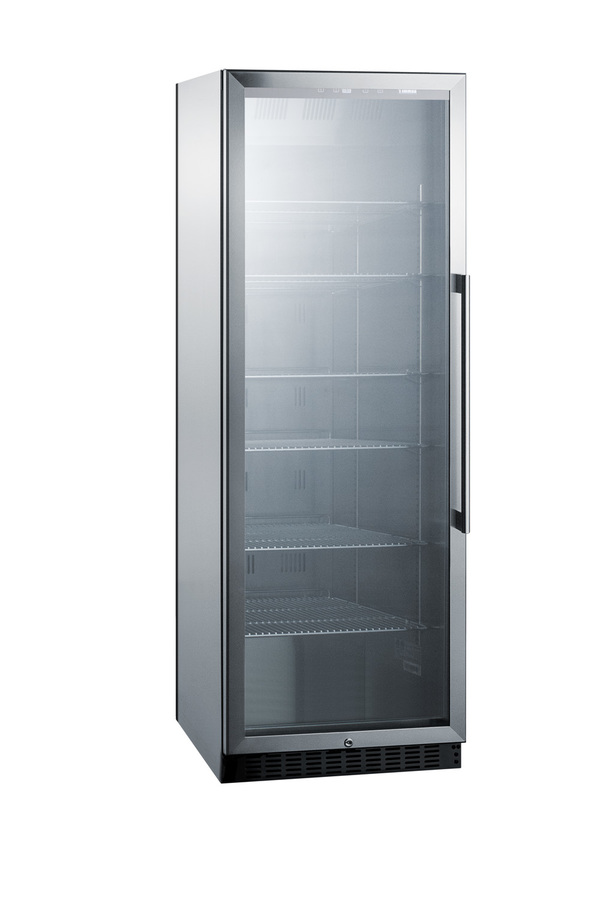 Summit's commercially approved beverage merchandisers are designed for durable service, convenient use, and attractive presentation. The SCR1401LHCSS is an upright beverage center conveniently sized with a slim 24 inch footprint. The stainless steel trimmed glass door provides a full view of storage down to the floor, with recessed LED lighting to ensure an attractive and efficient presentation. The door comes in a left hand door swing and features a self-closing design to help protect stored items in commercial settings where customers may not take the time to ensure a tight seal. A factory installed lock offers additional security. This unit has a front-breathing cooling system that allows built-in installation, and a fully finished stainless steel wrapped cabinet that also enables freestanding use. Inside, the SCR1401LHCSS utilizes frost-free operation for minimum user maintenance. The interior walls are made from stainless steel for improved durability and sanitation. The cantilevered shelving system allows you to easily adjust your storage to accommodate virtually any size. The digital control panel is conveniently located towards the top, allowing staff to adjust the temperature without bending to the floor. The readout can be viewed in Celsius or Fahrenheit. Additional features include an audible high temperature alarm, open door alarm, temperature memory function, and sabbath mode setting. The SCR1401LHCSS is ETL-S listed to NSF-7 standards for use in commercial settings. Similar choices are available in lower heights for more space-challenged areas. Browse Summit's commercial product line for more.