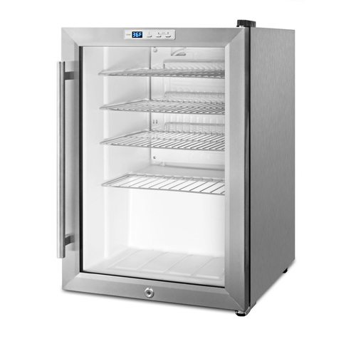 SUMMIT's SCR312LBICSS is a versatile beverage center that offers the perfect storage conditions in a compact fit. This compact unit can be used as a built-in or freestanding refrigerator. A stainless steel trimmed glass door includes a factory installed lock for convenient security and a pro style handle. This unit comes with stainless steel wrapped cabinet for added style and durability. Inside, the SCR312LBICSS utilizes automatic defrost for low maintenance operation. The digital thermostat makes it easy to manage the interior temperature, with an electronic readout for added convenience. This unit features recessed LED lighting to provide an attractive, energy efficient display of stored items. Adjustable chrome shelves accommodate a variety of sizes. The SCR312LBICSS is ETL-S listed to NSF commercial standards. With its compact size and user-friendly features, this unit is ideal for use as a minibar or commercial beverage merchandiser.