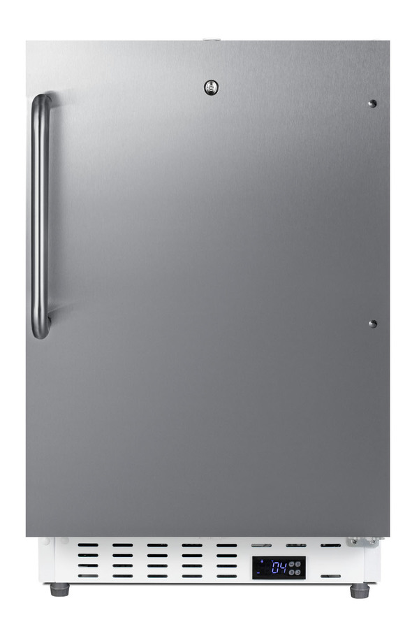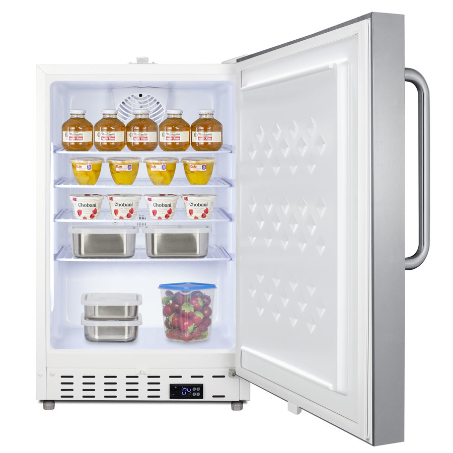 Summit Commercial manufactures a variety of refrigerator and freezer choices for smaller foodservice spaces, with slim-fitting options for undercounter use. Model SCR504SSTBADA is a commercial all-refrigerator sized at just under 21" wide and 32" high for installation under lower ADA compliant counters. Its front-breathing design and fully finished cabinet allow built-in or freestanding use for versatile placement. This model has a textured white cabinet and 304 grade stainless steel wrapped reversible door with a pro style towel bar handle. A factory-installed lock is located towards the top of the door, ensuring more comfortable access behind the bar. Easy digital controls are located in the kickplate. The temperature can be managed in Fahrenheit or Celsius. Inside, this refrigerator includes adjustable wire shelves, automatic LED lighting, and an internal fan to help ensure even cooling throughout the 3.32 cu.ft. interior. Audible open door and high/low temperature alarms help ensure stored contents are properly cooled. These alarms can also be disabled if preferred. The SCR504SSTBADA is ETL-S listed to NSF-7 commercial standards and features hydrocarbon refrigerant for a greener cooling system that meets CARB regulations. To create a matching set, pair with the SCF505SSTBADA all-freezer. Additional commercial refrigeration choices are available in more sizes and sizes. Browse the full Summit lineup for shallow depth back bar coolers, commercial wine cellars, icemakers, reach-in refrigeration, and much more.