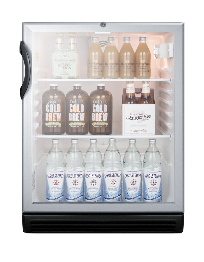 SUMMIT COMMERCIAL's freestanding SCR600BGLADA Series features 32" high beverage refrigerators designed and manufactured in Europe for quality storage and presentation in commercial establishments following ADA guidelines for lower counter height. Sized just under 24" wide and deep, the SCR600BGLADA offers a generous 5.5 cu.ft. of storage capacity. At 32" high, this unit is perfect for applications with lower ADA compliant counters. The user-reversible door features double pane tempered glass for added protection, with a brushed aluminum finish on the frame. The factory-installed front lock is located towards the top of the door for easier access. This unit comes with a black cabinet finish and is designed for freestanding use. For a built-in version, see the SCR600BGLBIADA. Inside, the SCR600BGLADA includes four adjustable glass shelves for spill-proof storage and a half-sized wire shelf ideal for holding bottles in place. Automatic defrost ensures minimum user maintenance and a dial thermostat makes it simple to manage the temperature. This unit features an interior light operated with an ON/OFF rocker switch and a white interior finish to ensure optimum product visibility. Our unique "hidden" evaporator is located in the rear wall to help protect the unit's system and maximize shelf space. An internal fan helps to ensure the interior is more evenly cooled from top to bottom. The SCR600BGLADA is ETL-S listed to NSF-7 commercial standards. Additional handle styles are available.