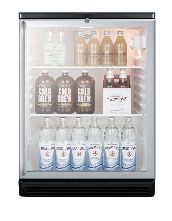 SUMMIT COMMERCIAL's freestanding SCR600BGLADA Series features 32" high beverage refrigerators designed and manufactured in Europe for quality storage and presentation in commercial establishments following ADA guidelines for lower counter height. Sized just under 24" wide and deep, the SCR600BGLSHADA offers a generous 5.5 cu.ft. of storage capacity. At 32" high, this unit is perfect for applications with lower ADA compliant counters. The door features double pane tempered glass for added protection, with a brushed aluminum finish on the frame. We include our full-length "SH" towel bar handle in a brushed stainless steel finish. The factory-installed front lock is located towards the top of the door for easier access. This unit comes with a black cabinet finish and is designed for freestanding use. For a built-in version, see the SCR600BGLBISHADA. Inside, the SCR600BGLSHADA includes four adjustable glass shelves for spill-proof storage and a half-sized wire shelf ideal for holding bottles in place. Automatic defrost ensures minimum user maintenance and a dial thermostat makes it simple to manage the temperature. This unit features an interior light operated with an ON/OFF rocker switch and a white interior finish to ensure optimum product visibility. Our unique "hidden" evaporator is located in the rear wall to help protect the unit's system and maximize shelf space. An internal fan helps to ensure the interior is more evenly cooled from top to bottom. The SCR600BGLSHADA is ETL-S listed to NSF-7 commercial standards. Additional handle styles are available.