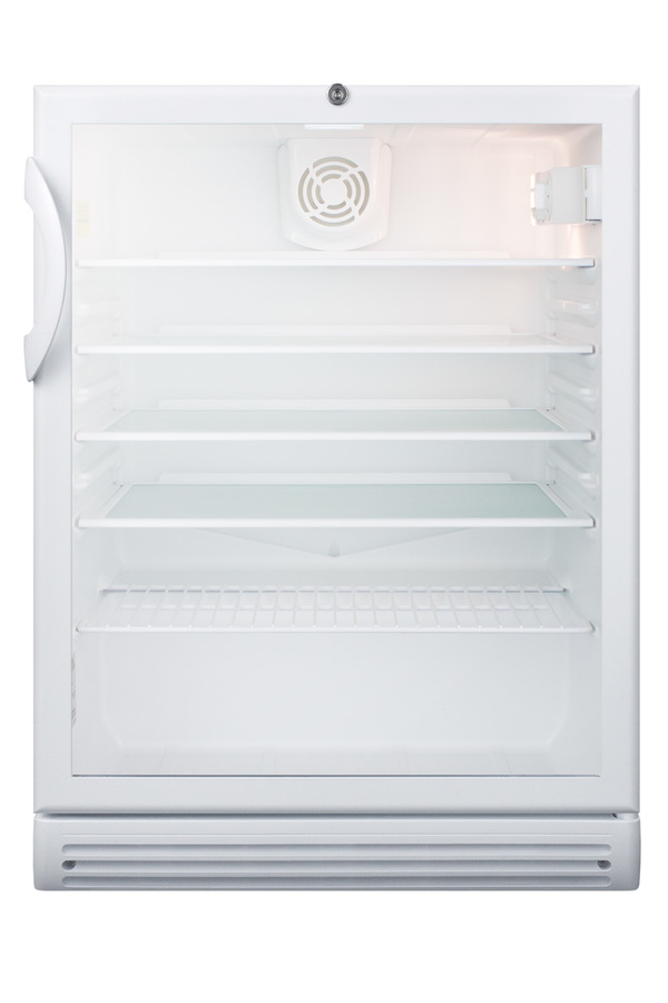 SUMMIT COMMERCIAL's SCR600GLBIADA Series features 32" high beverage refrigerators designed and manufactured in Europe for built-in installation under lower ADA compliant counters in commercial settings. The SCR600GLBIADA comes in a convenient 24" footprint with a generous 5.5 cu.ft. capacity. It has a front-breathing design for built-in installation and a fully finished white cabinet that also allows freestanding use. The user-reversible door features double pane tempered glass for added protection. The factory-installed front lock is located towards the top of the door for easier access. Inside, the SCR600GLBIADA includes four adjustable glass shelves for spill-proof storage and a half-sized wire shelf ideal for holding bottles in place. Automatic defrost ensures minimum user maintenance and a dial thermostat makes it simple to manage the temperature. This unit features an interior light operated with an ON/OFF rocker switch and a white interior finish to ensure optimum product visibility. Our unique "hidden" evaporator is located in the rear wall to help protect the unit's system and maximize shelf space. An internal fan helps to ensure the interior is more evenly cooled from top to bottom. Made in Europe, the SCR600GLBIADA is ETL-S listed to NSF-7 commercial standards. With its ADA compliant design, this unit is the perfect choice for any setting in need of a reliable commercial display refrigerator that fits in ADA compliant applications. Additional handle styles are available.