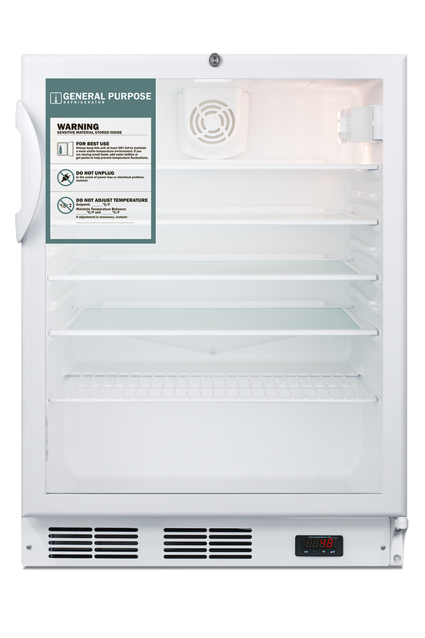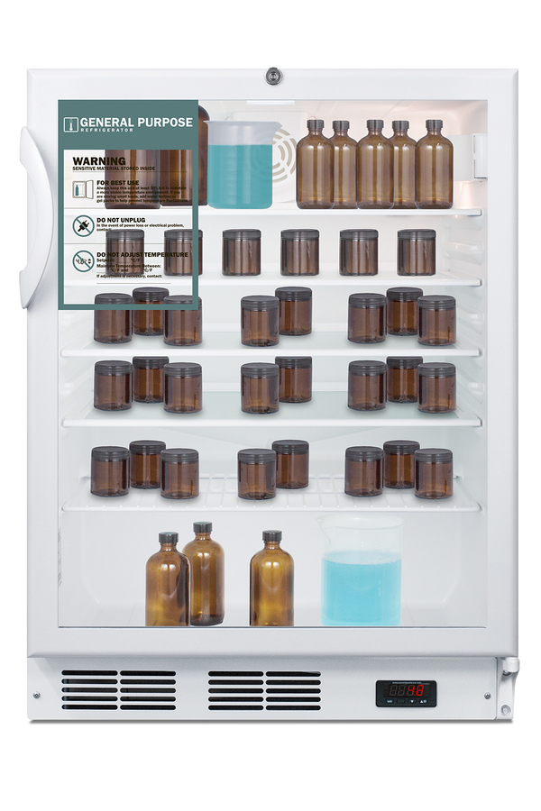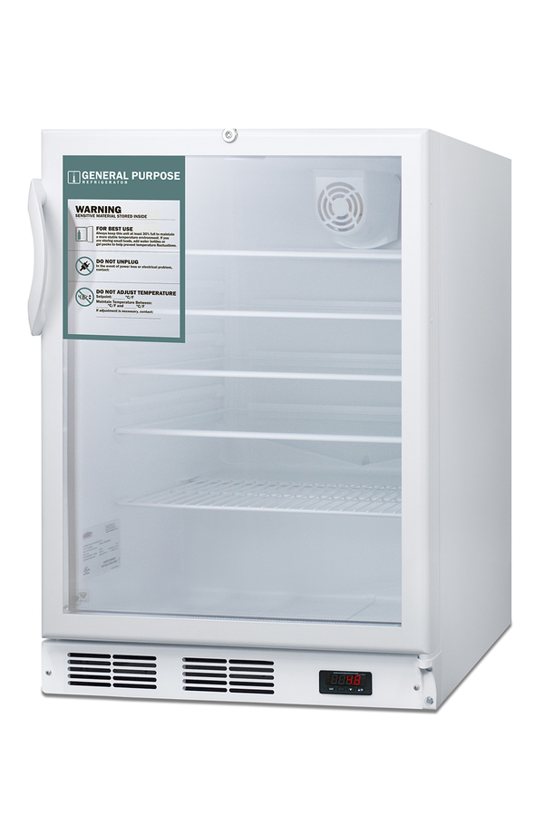Accucold's series of general purpose refrigeration includes a variety of choices ideal for use in healthcare applications. The SCR600GLBIADAGP is an ADA height all-refrigerator designed to offer an improved performance over similarly sized dorm fridges and residential units. Sized at just 24" deep and offering a generous 5.5 cu. ft. capacity, this unit comes with a white cabinet finish and is designed for freestanding use. The user-reversible door features double pane tempered glass for added protection and attractive storage. The factory-installed front lock is located towards the top of the door for easier access. A digital thermostat allows for easy temperature management of the unit's interior. Inside, the SCR600GLBIADAGP includes four adjustable glass shelves for spill-proof storage and a half-sized wire shelf ideal for holding bottles in place. Automatic defrost ensures minimum user maintenance and a dial thermostat makes it simple to manage the temperature. This unit features an interior light operated with an ON/OFF rocker switch and a white interior finish to ensure optimum product visibility. Our unique "hidden" evaporator is located in the rear wall to help protect the unit's system and maximize shelf space. An internal fan helps to ensure the interior is more evenly cooled from top to bottom. Sized just under 24 inches wide, the SCR600GLBIADAGP is a convenient solution to general purpose cold storage applications. It is ETL-S listed to NS-7 commercial standards. Note: Accucold's general purpose series refrigerators are intended for a wide variety of basic storage of non-critical products. For storage of high-value vaccines, life science materials, and medical or clinical biologicals, browse Accucold's Medical & Laboratory or Pharmacy & Vaccine Storage categories, or contact our product specialists to discuss your options at 1-888-4-MED-LAB.