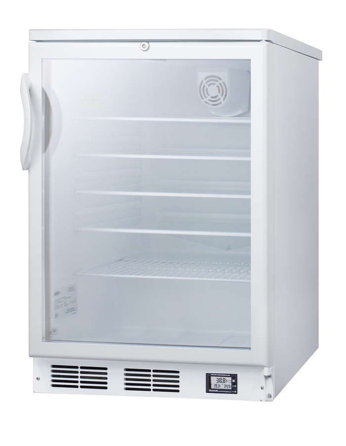 Accucold's Nutrition Center Series features commercially approved refrigerators and freezers specifically designed for the storage of sealed food and beverages in a variety of facilities, including break rooms, waiting areas, nurses' stations, and more. Made in Europe, the SCR600BGLBINZ is a display refrigerator sized with a convenient 24" footprint. The front-breathing system allows built-in installation under counters, while the fully finished cabinet also allows freestanding use. This unit is ETL-S listed to NSF-7 standards for the storage of sealed food and beverages. The kickplate features a factory installed digital thermometer that provides a continuous external display of the current and minimum/maximum temperature to the nearest tenth of a degree, making it easier for staff to monitor and record the temperature as needed. This device includes a built-in audible alarm that will sound if the unit rises or falls out of the set temperature range. The temperature probe is encased in a glycol-filled bottle to best simulate the temperature of stored contents. All temperature display devices are calibrated to NIST standards in our ISO/IEC 17025:2017 laboratory and include a certificate of calibration. Inside, the SCR600BGLBINZ utilizes low maintenance automatic defrost operation with a hidden evaporator and cold wall design. Adjustable glass shelves allow users to reconfigure the interior to accommodate a variety of sizes. This unit has an interior dial thermostat and light with an on/off rocker switch. The SCR600BGLBINZ comes in a white cabinet with a double pane tempered glass door and user-reversible door swing. A factory installed front lock is located towards the top of the door for convenient security. Designed specifically for institutional food and beverage storage, all Accucold's Nutrition Centers are commercially approved to NSF standards and comply with most JCAHO recommendations for safe storage. Additional sizes and variations are available.