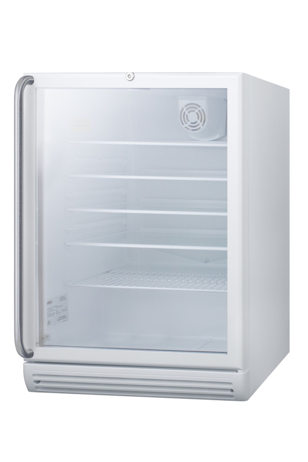 SUMMIT COMMERCIAL's SCR600GLBIADA Series features 32" high beverage refrigerators designed and manufactured in Europe for built-in installation under lower ADA compliant counters in commercial settings. The SCR600GLBISHADA comes in a convenient 24" footprint with a generous 5.5 cu.ft. capacity. It has a front-breathing design for built-in installation and a fully finished white cabinet that also allows freestanding use. The door features double pane tempered glass for added protection, with a full-length towel bar handle in brushed stainless steel. The factory-installed front lock is located towards the top of the door for easier access. Inside, the SCR600GLBISHADA includes four adjustable glass shelves for spill-proof storage and a half-sized wire shelf ideal for holding bottles in place. Automatic defrost ensures minimum user maintenance and a dial thermostat makes it simple to manage the temperature. This unit features an interior light operated with an ON/OFF rocker switch and a white interior finish to ensure optimum product visibility. Our unique "hidden" evaporator is located in the rear wall to help protect the unit's system and maximize shelf space. An internal fan helps to ensure the interior is more evenly cooled from top to bottom. Made in Europe, the SCR600GLBISHADA is ETL-S listed to NSF-7 commercial standards. With its ADA compliant design, this unit is the perfect choice for any setting in need of a reliable commercial display refrigerator that fits in ADA compliant applications. Additional handle styles are available.