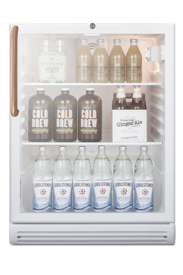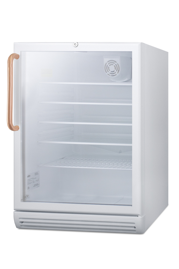 Accucold by Summit Appliance offers a quality line of refrigeration designed for healthcare applications, with pure copper handles that kill microbes. The SCR600GLBITBCADA comes in a convenient 24" footprint with a generous 5.5 cu.ft. capacity. It has a front-breathing design for built-in installation and a fully finished white cabinet that also allows freestanding use. The door features double pane tempered glass for added protection. The factory-installed front lock is located towards the top of the door for easier access. This unit has a right hand door swing. The SCR600GLBITBCADA includes a factory-installed towel bar style handle made from pure copper. Through its natural antimicrobial properties, copper will kill microbes, including viruses, in a shorter timeframe than most other metal surfaces allowing for a safer, cleaner user experience. Inside, the SCR600GLBITBCADA includes four adjustable glass shelves for spill-proof storage and a half-sized wire shelf ideal for holding bottles in place. Automatic defrost ensures minimum user maintenance and a dial thermostat makes it simple to manage the temperature. This unit features an interior light operated with an ON/OFF rocker switch and a white interior finish to ensure optimum product visibility. Our unique "hidden" evaporator is located in the rear wall to help protect the unit's system and maximize shelf space. An internal fan helps to ensure the interior is more evenly cooled from top to bottom. Made in Europe, the SCR600GLBITBCADA is ETL-S listed to NSF-7 commercial standards. With its ADA compliant design, this unit is the perfect choice for any setting in need of a reliable commercial display refrigerator that fits in ADA compliant applications. Additional handle styles are available.