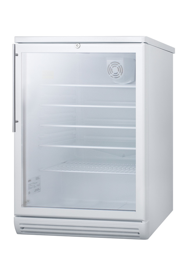 SUMMIT COMMERCIAL's freestanding SCR600GL Series features conveniently sized beverage refrigerators designed and manufactured in Europe for quality storage and presentation in commercial establishments. Sized under 24" wide and deep, the SCR600GLHV offers a generous 5.5 cu.ft. of storage capacity. The door features double pane tempered glass for added protection, with a thin vertically mounted handle in brushed stainless steel. The factory-installed front lock is located towards the top of the door for easier access. This unit comes with a white cabinet finish and is designed for freestanding use. Inside, the SCR600GLHV includes four adjustable glass shelves for spill-proof storage and a half-sized wire shelf ideal for holding bottles in place. Automatic defrost ensures minimum user maintenance and a dial thermostat makes it simple to manage the temperature. This unit features an interior light operated with an ON/OFF rocker switch and a white interior finish to ensure optimum product visibility. Our unique "hidden" evaporator is located in the rear wall to help protect the unit's system and maximize shelf space. An internal fan helps to ensure the interior is more evenly cooled from top to bottom. The SCR600GLHV is ETL-S listed to NSF-7 commercial standards. Built-in capable and ADA compliant choices are also available.