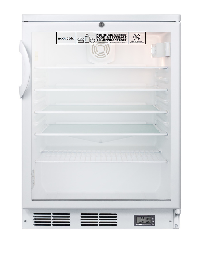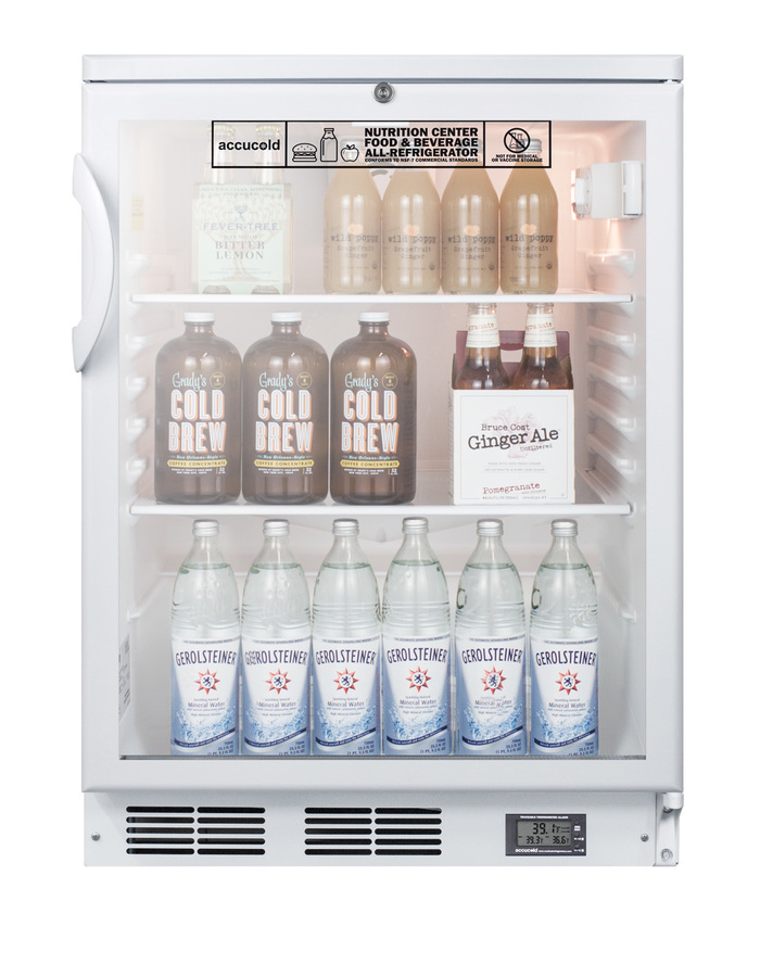 Accucold's Nutrition Center Series features commercially approved refrigerators and freezers specifically designed for the storage of sealed food and beverages in a variety of facilities, including break rooms, waiting areas, nurses' stations, and more. Made in Europe, the SCR600GLNZ is a counter height display refrigerator sized with a convenient 24" footprint. It is ETL-S listed to NSF-7 standards for the storage of sealed food and beverages. The kickplate features a factory installed digital thermometer that provides a continuous external display of the current and minimum/maximum temperature to the nearest tenth of a degree, making it easier for staff to monitor and record the temperature as needed. This device includes a built-in audible alarm that will sound if the unit rises or falls out of the set temperature range. The temperature probe is encased in a glycol-filled bottle to best simulate the temperature of stored contents. All temperature display devices are calibrated to NIST standards in our ISO/IEC 17025:2017 laboratory and include a certificate of calibration. Inside, the SCR600GLNZ utilizes low maintenance automatic defrost operation with a hidden evaporator and cold wall design. Adjustable glass shelves allow users to reconfigure the interior to accommodate a variety of sizes. This unit has an interior dial thermostat and light with an on/off rocker switch. The SCR600GLNZ comes in a white cabinet with a double pane tempered glass door and user-reversible door swing. A factory installed front lock is located towards the top of the door for convenient security. This unit is designed for freestanding use. For a built-in version, see the SCR600BGLBINZ. Designed specifically for institutional food and beverage storage, all Accucold's Nutrition Centers are commercially approved to NSF standards and comply with most JCAHO recommendations for safe storage. Additional sizes and variations are available.