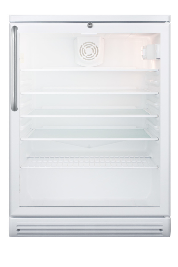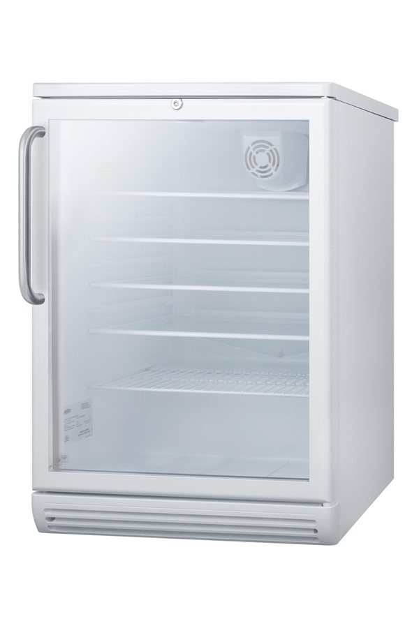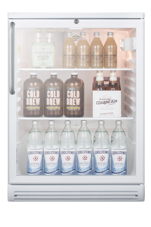 SUMMIT COMMERCIAL's freestanding SCR600GL Series features conveniently sized beverage refrigerators designed and manufactured in Europe for quality storage and presentation in commercial establishments. Sized under 24" wide and deep, the SCR600GLTB offers a generous 5.5 cu.ft. of storage capacity. The door features double pane tempered glass for added protection, with a towel bar handle in brushed stainless steel. The factory-installed front lock is located towards the top of the door for easier access. This unit comes with a white cabinet finish and is designed for freestanding use. Inside, the SCR600GLTB includes four adjustable glass shelves for spill-proof storage and a half-sized wire shelf ideal for holding bottles in place. Automatic defrost ensures minimum user maintenance and a dial thermostat makes it simple to manage the temperature. This unit features an interior light operated with an ON/OFF rocker switch and a white interior finish to ensure optimum product visibility. Our unique "hidden" evaporator is located in the rear wall to help protect the unit's system and maximize shelf space. An internal fan helps to ensure the interior is more evenly cooled from top to bottom. The SCR600GLTB is ETL-S listed to NSF-7 commercial standards. Built-in capable and ADA compliant choices are also available.