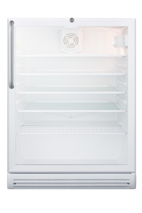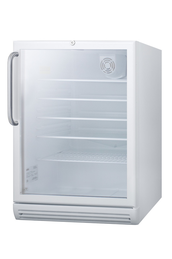 SUMMIT COMMERCIAL's freestanding SCR600GLADA Series features 32" high beverage refrigerators designed and manufactured in Europe for quality storage and presentation in commercial establishments following ADA guidelines for lower counter height. Sized just under 24" wide and deep, the SCR600GLTBADA offers a generous 5.5 cu.ft. of storage capacity. At 32" high, this unit is perfect for applications with lower ADA compliant counters. The door features double pane tempered glass for added protection, with a stainless steel handle in a curved towel bar style. The factory-installed front lock is located towards the top of the door for easier access. This unit comes with a white cabinet finish and is designed for freestanding use. For a built-in version, see the SCR600GLBITBADA. Inside, the SCR600GLTBADA includes four adjustable glass shelves for spill-proof storage and a half-sized wire shelf ideal for holding bottles in place. Automatic defrost ensures minimum user maintenance and a dial thermostat makes it simple to manage the temperature. This unit features an interior light operated with an ON/OFF rocker switch and a white interior finish to ensure optimum product visibility. Our unique "hidden" evaporator is located in the rear wall to help protect the unit's system and maximize shelf space. An internal fan helps to ensure the interior is more evenly cooled from top to bottom. The SCR600GLTBADA is ETL-S listed to NSF-7 commercial standards. Additional handle styles are available.