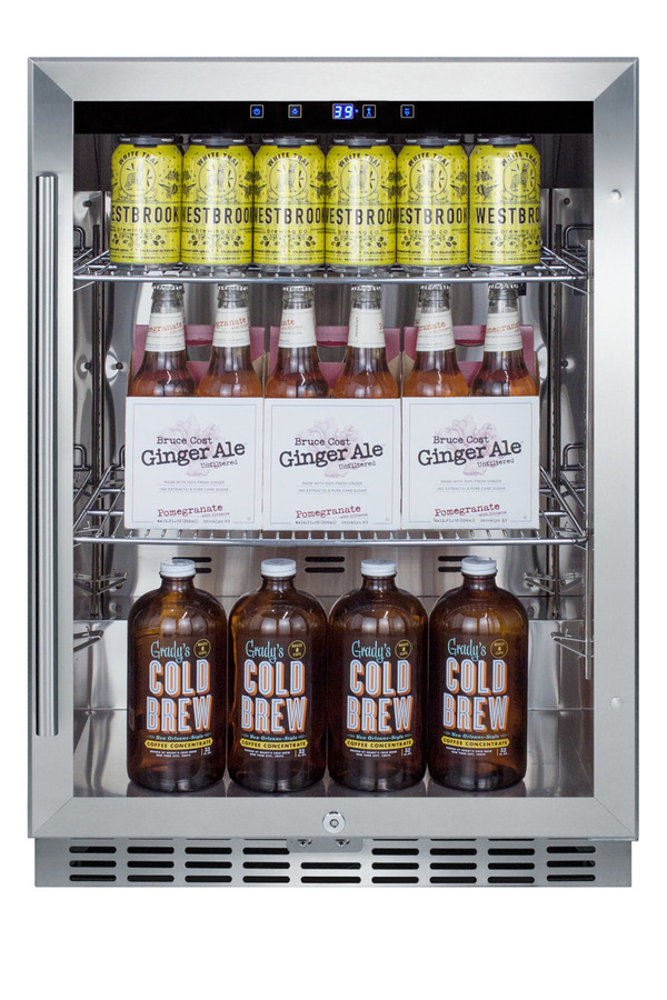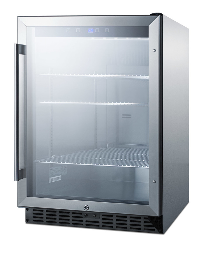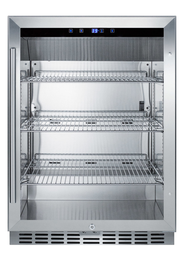Summit Commercial's line of outdoor appliances includes built-in undercounter display refrigerators designed for optimum storage and product presentation. The SCR611GLOS is a commercial outdoor beverage center that is ETL-S listed to NSF-7 standards. The weatherproof design features a 304 grade stainless steel wrapped cabinet and sealed back to help keep the unit safe from the elements, with an integrated ground fault circuit interrupter for added protection. The stainless steel trimmed door features double pane tempered glass and a pro style handle. The door is user-reversible for added flexibility and includes a factory-installed lock. The front-breathing design allows it to be built-in under counters, while the fully finished cabinet is also capable of freestanding use. Inside, the SCR611GLOS features stainless steel construction for lasting durability and easier cleanup. Cantilevered shelving lets you adjust your storage to virtually any position, with three chrome shelves included. Recessed LED lighting provides an attractive and energy efficient display of the interior. The digital control panel makes it easy to manage the temperature and includes a readout viewable in Celsius or Fahrenheit. Additional features include an open door alarm, high temperature alarm, and Sabbath mode setting that lets you disable some of the electrical elements during periods of observance. Sized with a convenient 24 inch footprint, the SCR611GLOS is a great choice for bringing flexible and convenient beverage storage to outdoor commercial settings. NOTE: Product details may vary from pictured unit