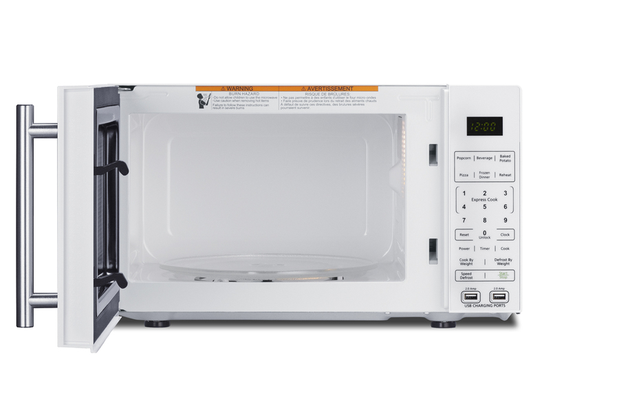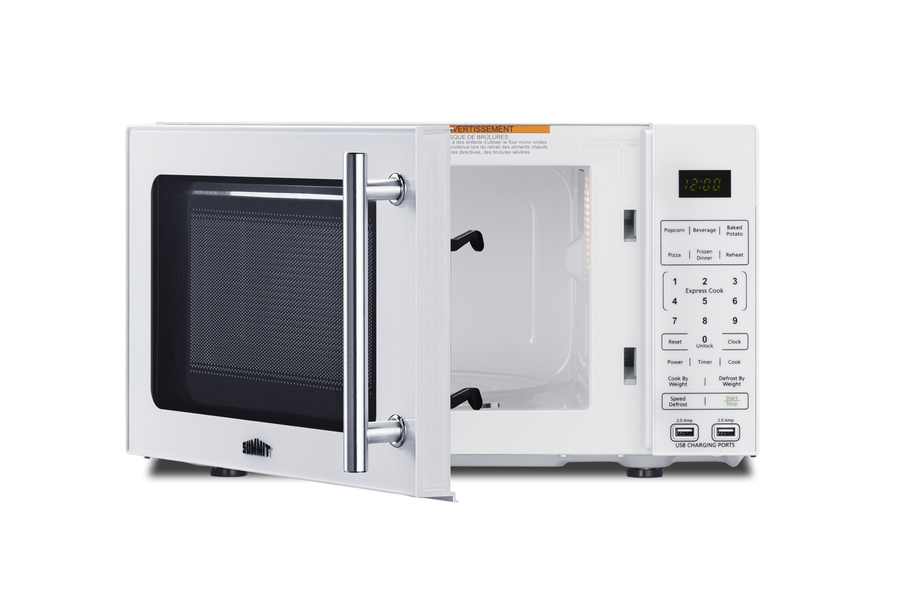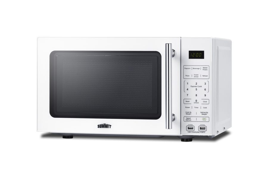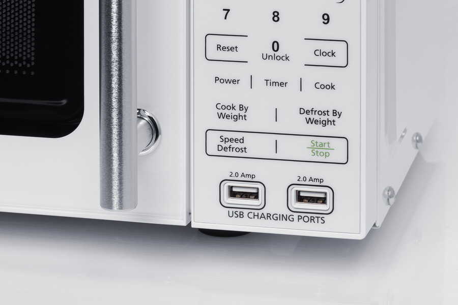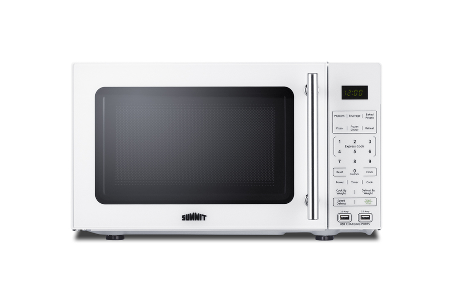 Summit's selection of microwave ovens includes fully featured models specially designed to maximize convenience in residential and hospitality settings. Model SM904WA is a countertop microwave in a white finish finish, with a door window for convenient viewing and an easy-grab handle in brushed stainless steel. The rear features a built-in allocator that accepts a 2 or 3-prong plug, making this unit ideal for 1-cord use with a refrigerator, coffeemaker, or other appliance. The allocator automatically disables the second appliance when the microwave is in use, resuming power after the cycle is finished in order to prevent power surges. Two USB ports are built into the front to allow for charging of mobile devices. The digital control panel features one-touch settings for pizza, potatoes, popcorn beverages, frozen dinners, and reheating. Additional settings let you auto defrost, cook by weight, or add 30 seconds for fast reheating. Multi-stage cooking lets you combine different functions. The digital display can be disabled in eco mode and the end-of-cycle alerts muted at the touch of a button. This microwave features a clean white interior with a removable glass turntable. With its compact size and innovative power-saving design, the SM904WA offers convenient benefits for a variety of locations. For this unit in black, see the SM903BSA1.