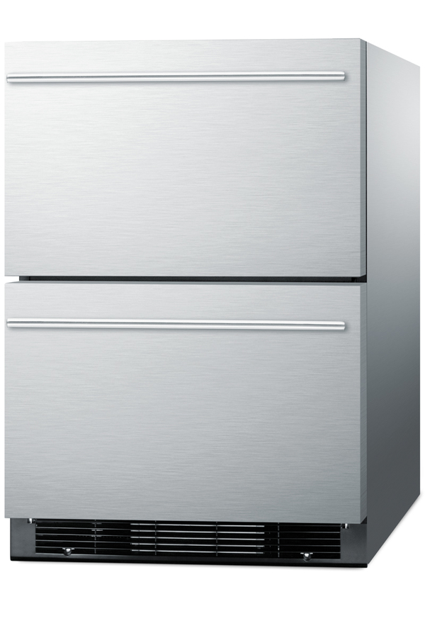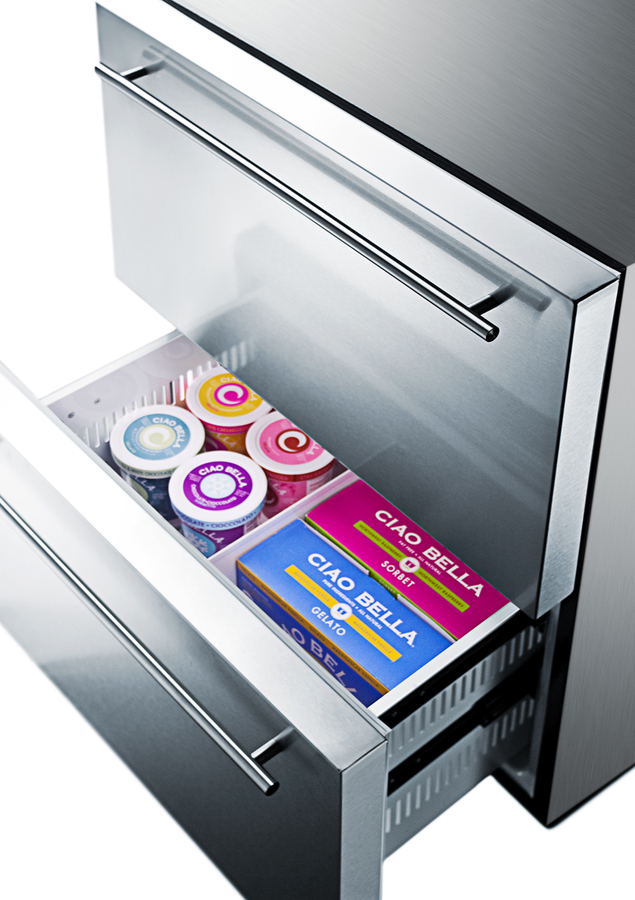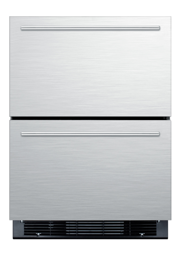 Summit's extensive selection of built-in undercounter drawer refrigeration brings space-saving storage in a variety of stunning designs. The SPRF2D5 is a 2-drawer refrigerator-freezer designed and manufactured in North America. The front-breathing system enables built-in installation under counters, while the fully finished stainless steel cabinet also allows it to be used freestanding. It comes in a 24 inch wide fit, with stainless steel drawer fronts complete with pro style handles. Both the top drawer refrigerator and bottom drawer freezer utilize full frost-free operation, ensuring a low maintenance performance with reliable cooling. A digital thermostat ensures easy temperature management and an interior light provides a convenient view of stored items. With a unique design fully equipped for user convenience, the SPRF2D5 makes an attractive yet functional addition to any home. For this unit with a factory-installed icemaker, see the SPRF2D5IM.
