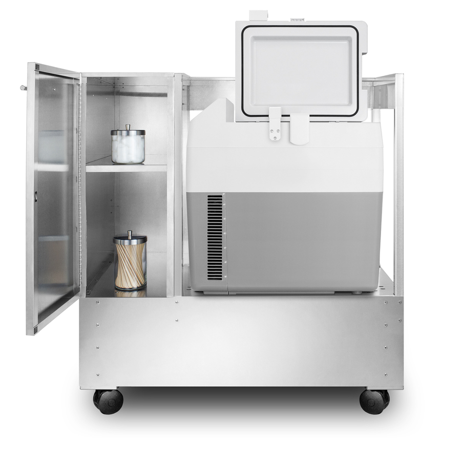 Accucold brings innovative solutions to portable vaccine storage and distribution with the SPRF36LCART. Sized at just under 40" wide, the SPRF36LCART combines our stainless steel rolling cart with the SPRF36 portable refrigerator-freezer for a complete vaccination station. This ships in two boxes on one pallet. The fully assembled rolling cart features a weatherproof design made from 304 grade stainless steel, perfect for high traffic areas like hospitals or outdoor walk-up or drive-up medical settings. A magnetically closing cabinet with a fixed interior shelf and an exterior side rack offer convenient storage options for disposables and other non-refrigerated items. Four factory-installed wheels assure easy mobility. The SPRF36 refrigerator-freezer is also included. This lightweight compressor-operated unit can be used as a refrigerator or freezer. The refrigerator has a temperature range of 2-8°C perfect for storing samples, vaccines, and additional medical supplies, while the freezer can reach -15°C, allowing for the storage of select vaccination materials, ice packs and more. A digital thermostat with an external LED thermometer display allows easy temperature control without requiring users to open the lid. The hammered aluminum interior can hold up to 30 liters, while the gray, plastic exterior provides added durability, with handles located on each side for easier lifting as needed. A factory-installed lock provides added security, with two keys included. This unit can be plugged into the 12V DC lighter socket of any vehicle or 24V source. We also include an AC adapter that allows the SPRF36 to be plugged into a 120V electrical outlet. With a conveniently versatile design and reliable storage conditions, SPRF36LCART is ideal for applications that require easy transportation of cold items, such as collecting samples or administering vaccines at an off-site location. NOTE: Accucold refrigerators are purpose-built to the support meeting the current CDC (Centers for Disease Control) guidelines for the storage of vaccines. At this time, Accucold refrigerators have not been evaluated to the new NSF 456 standard. For additional temperature assurance, the CDC recommends a calibrated digital data logger (DDL), which can be added with the purchase of a DLSA11CAL accessory.