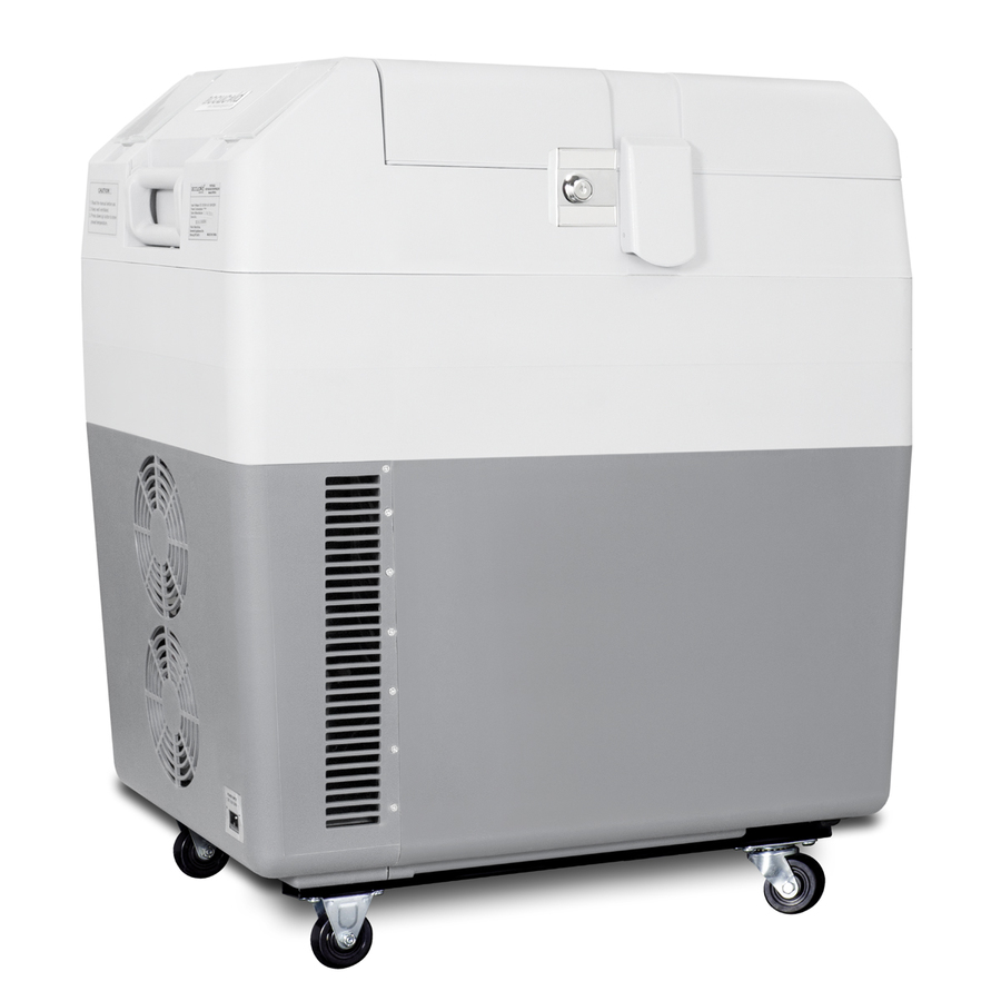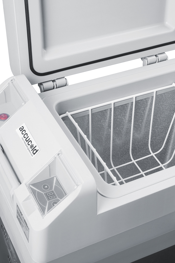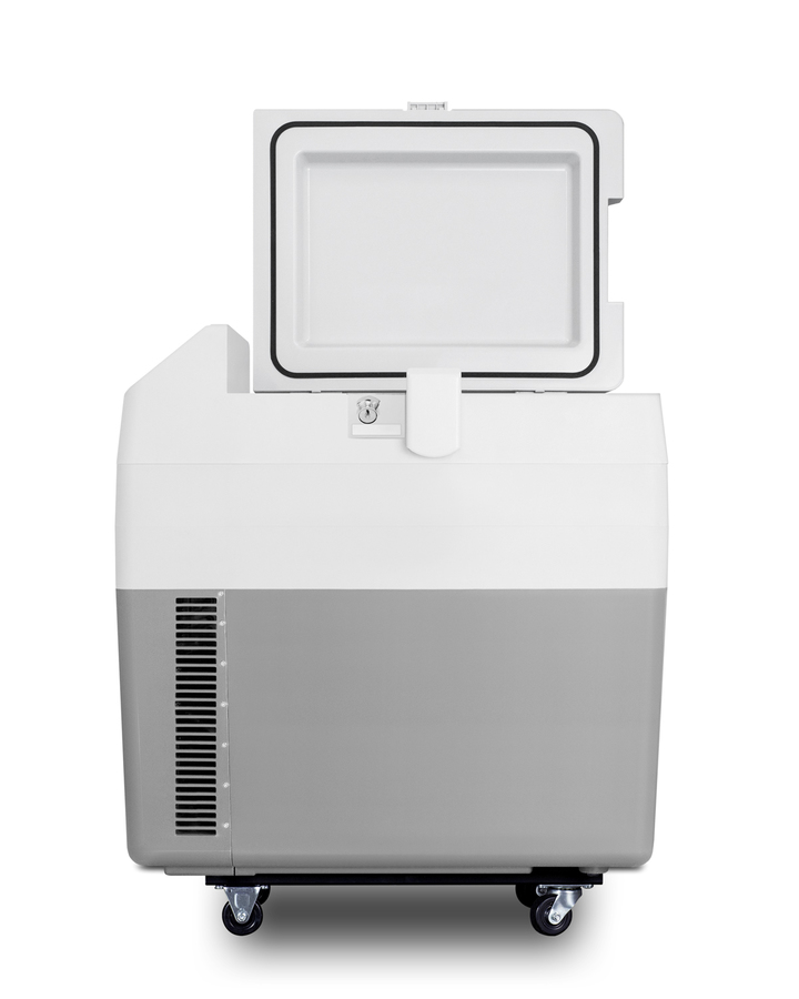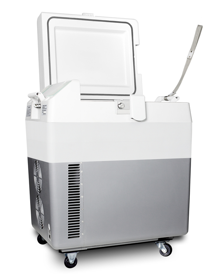 Accucold brings advanced convenience to cold chain management with the SPRF36M2, a fully featured portable cooler that can be set at refrigerator or freezer temperatures for the storage of select specimens, vaccines, and other materials. This lightweight compressor-operated unit can be plugged into the 12V DC lighter socket inside any car, truck, RV, or boat, as well as 24V sources. We also include an AC adapter to allow the SPRF36M2 to be plugged into a 120V electrical wall outlet. It has a gray, plastic exterior for added durability. Four pre-installed wheels make moving the unit simple and easy, while the strap handle provides additional portability options for user convenience. Handles are also located on each side for easier lifting as needed. A factory-installed lock provides added security, with two keys included. The SPRF36M2 can be used as a refrigerator or freezer. The refrigerator has a temperature range of 2-8°C perfect for storing samples, vaccines, and additional medical supplies, while the freezer can reach -15°C, allowing for the storage of select vaccination materials, ice packs and more. A digital thermostat with an external LED thermometer display allows easy temperature control without requiring users to open the lid. The hammered aluminum interior can hold up to 30 liters. With a conveniently versatile design and reliable storage conditions, the SPRF36M2 is ideal for applications that require easy transportation of cold items, such as collecting samples or administering vaccines at an off-site location. Additional choices in larger and smaller sizes are available. Visit www.accucold.com to view our entire line of portable refrigeration. NOTE: Accucold refrigerators are purpose-built to the support meeting the current CDC (Centers for Disease Control) guidelines for the storage of vaccines. At this time, Accucold refrigerators have not been evaluated to the new NSF 456 standard. For additional temperature assurance, the CDC recommends a calibrated digital data logger (DDL), which can be added with the purchase of a DLSA11CAL accessory.