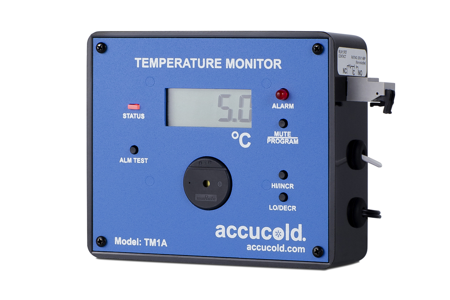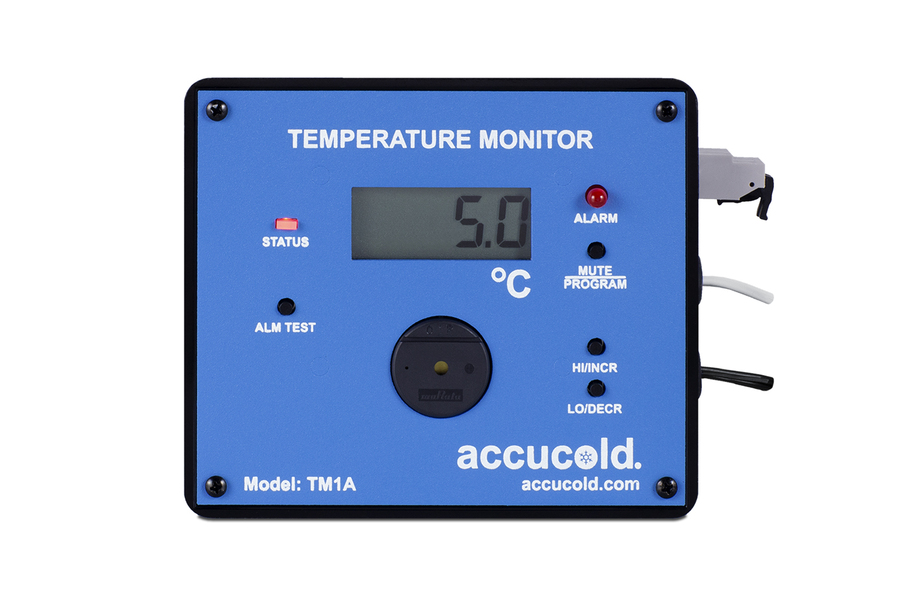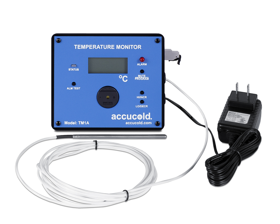NOTE: The TM1AKIT is for aftermarket installation. It ships in a single box with the following items included: TM1A temperature monitor, 115V power adapter with a 10' long cord and 2-prong plug, an external temperature sensor encased in a bottle filled with glycol, and adhesive strips for installation. If you want this unit installed on an Accucold or Summit refrigerator, order the TM1A option with your unit. Contact your sales representative for details and pricing on pre-installation. Accucold's TM1AKIT allows you to connect your refrigeration equipment to your facility's remote monitoring system while providing a continuous temperature readout of the current and high/low temperatures in an easy-to-read LCD display. It operates with a +/-1ºC accuracy when measuring in a range of -100ºC to +100ºC. The temperature probe is encased in a glycol-filled bottle to protect it from rapid changes when the door is opened, better simulating the temperature of stored contents instead of air temperature. It has a 10' long Teflon cable to allow for easy installation inside your refrigerator. Users can program the audible and visual high/low alarm set points and initial alarm delay time. Parameters are stored in non-volatile memory and are maintained even when power is removed.