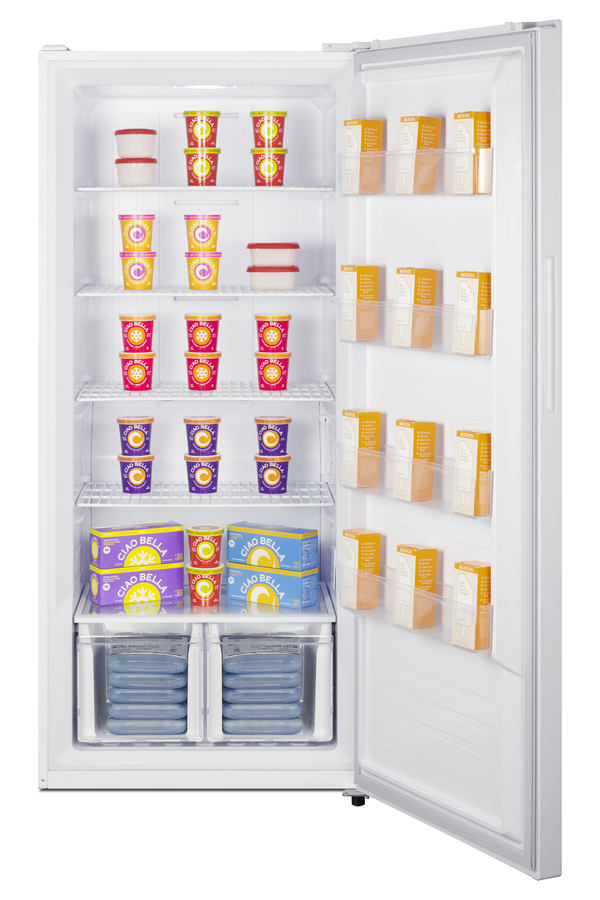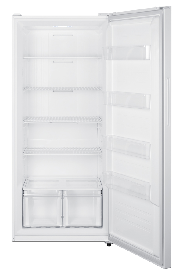 Summit's selection of full-sized units offers generous storage capacity for a variety of cold storage applications, with frost-free upright all-freezers to ensure low maintenance use in busy facilities. Model UF21W is an upright all-freezer with a 20.8 cu.ft. storage capacity. It comes in a white exterior finish with a textured cabinet and user-reversible door swing. This unit has a sealed back for easier cleanup and a right angle cord to allow a better fit. A simple touch control thermostat is located inside for easy use. The UF21W utilizes frost-free operation, eliminating the need to manually defrost the interior. Adjustable wire shelves accommodate a variety of sizes, with clear twin crispers located at the bottom. Four removable door racks are also included. This unit features LED lighting for an efficient view. With its low maintenance design and large storage capacity, the UF21W is the ideal storage solution for any home or break room in need of a reliable freezer for extra storage of frozen goods. Note: This product is intended for a wide variety of basic storage applications. Storage of high-value vaccines, life science materials, and medical/clinical biologicals require a product offering tighter temperature control and/or alarms, monitoring, and backup. For more information, browse Accucold's purpose-built line or contact our product specialists at 1-888-4-MED-LAB.