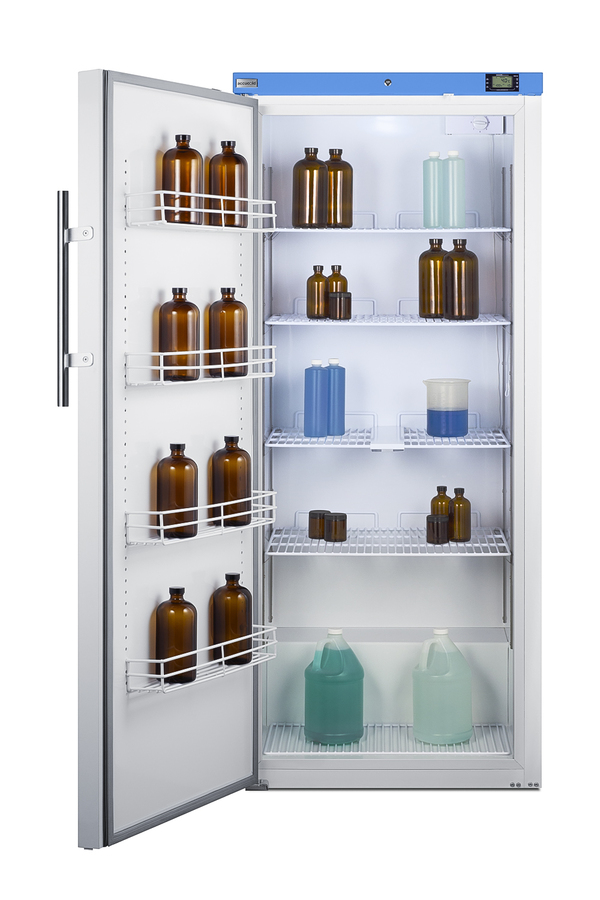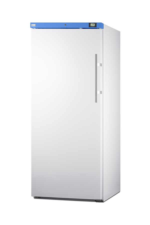 Accucold's general purpose series offers reliable cold storage in a variety of designs, including full-sized manual defrost all-refrigerators ideal for laboratory and clinical settings that require temperatures with more stability than traditional no-frost equipment. Model URM19WLHD is an upright all-refrigerator with an 18.3 cu.ft. interior storage capacity. Manual defrost operation ensures a more stable interior with none of the warming cycles that can compromise temperature in traditional frost-free cooling systems. The dial thermostat is located inside to prevent accidental temperature adjustments, with a thermometer/alarm mounted externally to ensure a readout of the current and high/low interior temperature is visible without opening the door. The temperature probe is encased in glass beads and positioned in a fixed shelf in the center of the unit to best simulate the temperature of stored items. We include an additional probe hole to accommodate additional monitoring equipment. This refrigerator features cantilevered shelves to provide more flexibility in storage, with tight spacing between the pilasters so you can adjust as needed. Four adjustable door racks are also included for optional storage. This unit features LED lighting for an efficient view. It comes in a white exterior finish with a right-hand door swing and powerful seal to ensure items are protected. The URM19WLHD comes with a left hand door swing and factory-installed lock located towards the top of the door. It includes a 9'5" long power cord with a hospital-grade 'green dot' plug for a more secure connection, ideal for high-traffic environments. The cooling system utilizes hydrocarbon refrigerant for a greener footprint. This model meets NSF-7 commercial standards and is ETL-listed for the U.S. and Canada. For a matching freezer, see model UFM19W. With its large storage capacity and advanced features, the URM19WLHD is ideal for storing non-critical products in research, clinical, and industrial laboratory applications. Additional choices from Accucold are available, including no-frost options and purpose-built refrigeration approved to the NSF/ANSI Vaccine Storage Standard.