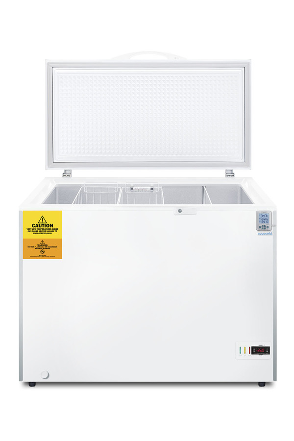 Accucold's low temperature laboratory series includes a range of chest freezers capable of operating at -35º C (-31º F). The VLT104 is a manual defrost chest freezer with 10 cu.ft. of storage capacity designed to store laboratory and institutional materials at -35ºC. It includes a digital thermostat and high/low temperature alarm with an external temperature readout, calibrated to NIST standards in our ISO/IEC 17025:2017 accredited laboratory. We include a 2-year certificate of calibration for your records, as well as the option of re-calibrating your temperature probe at the time of its expiration. This freezer comes in a white finish with stainless steel bumpers pre-installed on the front corners for added protection in high traffic settings. The counterbalanced hinges allow you to keep the lid open when loading and unloading, with an easy grab handle and keyed lock included. The hammered aluminum interior includes two wire storage baskets. Additional sizes in our -35ºC series are available, as well as lower temperature options. Browse the complete Accucold lineup or contact our product specialists to best meet your cold storage equipment needs. NOTE: Accucold freezers are purpose-built to the support meeting the current CDC (Centers for Disease Control) guidelines for the storage of vaccines. As referenced in the current Vaccine Storage and Handling Toolkit, these units incorporate several key features for stable operation. For additional temperature assurance, the CDC recommends a calibrated digital data logger (DDL), which can be added with the factory-installed option DL2B or addition of the DL2BKit accessory. Select Accucold products have been tested and certified to the new NSF 456 standard, and are now available for purchase. For additional information, contact our products specialists.