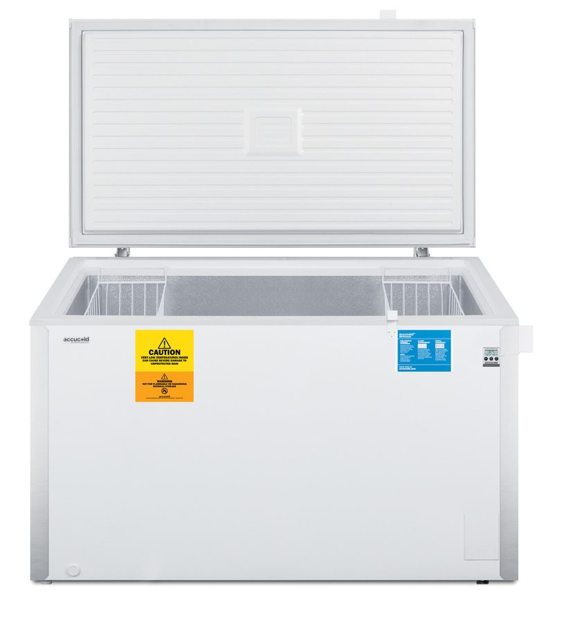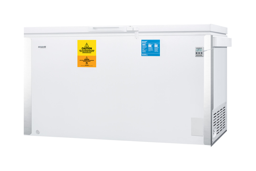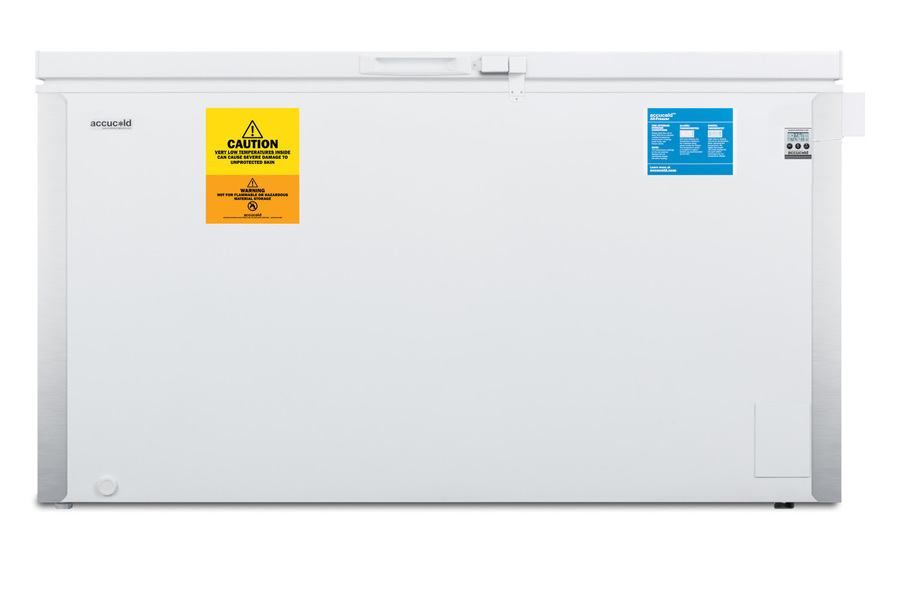 Accucold's low temperature laboratory series features fully featured freezers capable of reaching -30º C (-22º F). The VT125 is a chest freezer with 14.1 cu.ft. of storage capacity. Designed for optimum temperature performance, it can safely hold vaccines, pharmaceuticals, and even frozen foods under stable conditions with manual defrost operation. A digital thermostat includes easy electronic controls for precise temperature management and a battery-powered thermometer is installed to provide the most accurate temperature readout. The thermometer includes an audible alarm to warn of any high or low variations in temperature. Corner protectors help to protect the unit's exterior from bumps or dents and counterbalanced hinges provide an easy lift on the lid. A front lock is included for added security. This unit is UL-S listed to NSF-7 and UL-471 commercial standards.
