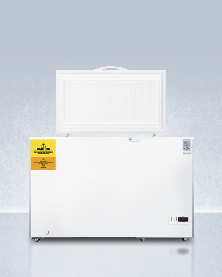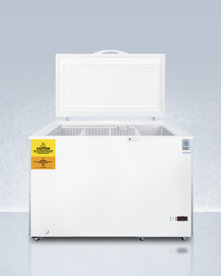 Accucold's low temperature laboratory series includes a range of chest freezers capable of operating at -30º C (-22º F). The VT133 is a manual defrost chest freezer with 12.1 cu.ft. of storage capacity designed to store laboratory and institutional materials at -30ºC. It includes a digital thermostat and high/low temperature alarm with an external temperature readout, calibrated to NIST standards in our ISO/IEC 17025:2017 accredited laboratory. We include a 2-year certificate of calibration for your records, as well as the option of re-calibrating your temperature probe at the time of its expiration. This freezer comes in a white finish with stainless steel bumpers pre-installed on the front corners for added protection in high traffic settings. The counterbalanced hinges allow you to keep the lid open when loading and unloading, with an easy grab handle and keyed lock included. The hammered aluminum interior includes two wire storage baskets. Additional sizes in our -30ºC series are available, as well as lower temperature options. Browse the complete Accucold lineup or contact our product specialists to best meet your cold storage equipment needs. NOTE: Accucold freezers are purpose-built to the support meeting the current CDC (Centers for Disease Control) guidelines for the storage of vaccines. As referenced in the current Vaccine Storage and Handling Toolkit, these units incorporate several key features for stable operation. For additional temperature assurance, the CDC recommends a calibrated digital data logger (DDL), which can be added with the factory-installed option DL2B or addition of the DL2BKit accessory. Select Accucold products have been tested and certified to the new NSF 456 standard, and are now available for purchase. For additional information, contact our products specialists.