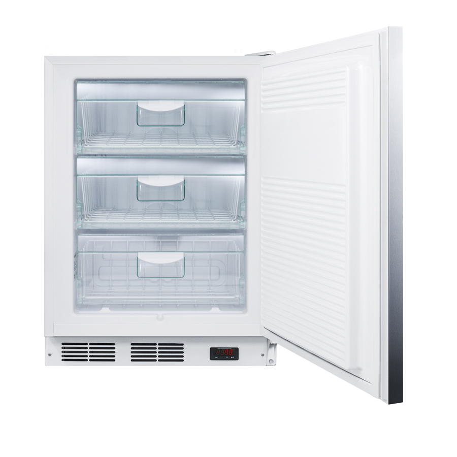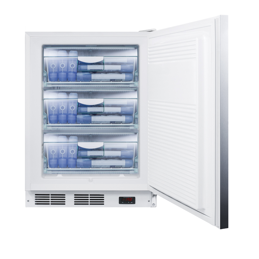 Accucold VT65M7BIADA commercial and medical all-freezers offer low temperature storage in a perfectly sized footprint designed for built-in installation under lower ADA compliant counters. The 32” high VT65ML7BISSHHADA can be used built-in or freestanding in any 24” space, with low temperature manual defrost operation that can reach -25ºC. The interior includes three slide-out basket drawers for convenient storage that keeps items cold when the door is opened. Additional features include an adjustable thermostat and one-piece interior liner for easier cleanup. This medical unit has a white cabinet and 304 grade stainless steel wrapped door. A horizontally mounted stainless steel handle with a sleek 14mm diameter completes the look and a factory installed lock offers added security. This model is ETL-S listed to NSF-7 commercial standards. NOTE: ALL VT65M FREEZERS ARE DESIGNED FOR MEDICAL OR COMMERCIAL USE ONLY. THESE ARE NOT HOUSEHOLD FREEZERS.