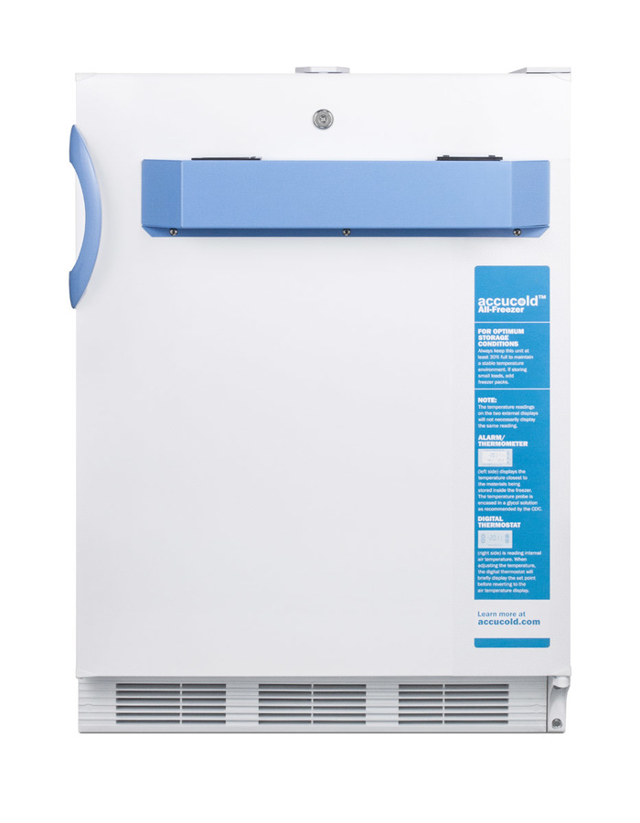 Accucold's MED2 series puts the most commonly requested features into a quality line of all-refrigerators and freezers specially designed to store vaccines and other sensitive materials in medical, scientific, pharmaceutical, and laboratory institutions. The VT65MLBI7MED2ADA is a commercially listed all-freezer sized in a convenient 24" footprint and 32" height. The front breathing design allows built-in installation under lower ADA compliant counters, while the fully finished cabinet in white also enables freestanding use. This unit is designed with an external front control panel that allows users to adjust and monitor the temperature without opening the door or bending down to the floor. The front keyed lock is located towards the top of the door for added convenience. A hospital grade 'green dot' cord offers added safety in high traffic environments. As recommended by the CDC, VFC and VFA programs, the VT65MLBI7MED2ADA is equipped with a NIST calibrated thermometer that displays the current, minimum, and maximum temperatures to the nearest tenth of a degree with a readout viewable in Celsius or Fahrenheit. Each VT65MLBI7MED2ADA ships with a certificate of calibration for your records. The thermometer includes an audible alarm to warn users if the interior has gone out of the programmed temperature range. The buffered temperature probe is encased in a glycol-filled bottle to best simulate the temperature of other stored contents, resulting in the utmost accuracy for temperature reporting. We include a pre-installed 3/8" probe hole for users who wish to install additional monitoring equipment. The VT65MLBI7MED2ADA features a 3.2 cu.ft. interior capacity and extra thick walls for reliable insulation. Slide-out baskets with clear plastic fronts allow users to view stored contents without exposing them to room temperature every time the door is opened. This low temperature freezer is designed to operate between -12ºC to -25ºC, an ideal temperature for certain vaccines, samples, and other sensitive medical materials. It has a flat door liner as recommended by the CDC. All MED2 series units are assembled in the USA from domestic and imported components. The VT65MLBI7MED2ADA can be paired with a matching all-refrigerator (FF7LBIMED2ADA). This unit can also be customized with additional features, including a self-closing door or USB temperature logger with a digital display. Contact our product specialists to learn more. Products in the MED2 series come with a two year warranty on parts and labor and a five year warranty on the compressor. *NOTE: This unit's thermostat is pre-set for Celsius. If you prefer Fahrenheit, add complimentary option DTMEDF or let your sales representative know upon order. NOTE: Accucold freezers are purpose-built to the support meeting the current CDC (Centers for Disease Control) guidelines for the storage of vaccines. At this time, Accucold refrigerators have not been evaluated to the new NSF 456 standard. As referenced in the current Vaccine Storage and Handling Toolkit, these units incorporate several key features for stable operation. For additional temperature assurance, the CDC recommends a calibrated digital data logger (DDL), which can be added with the factory-installed option DL2B or addition of the DL2BKit accessory.